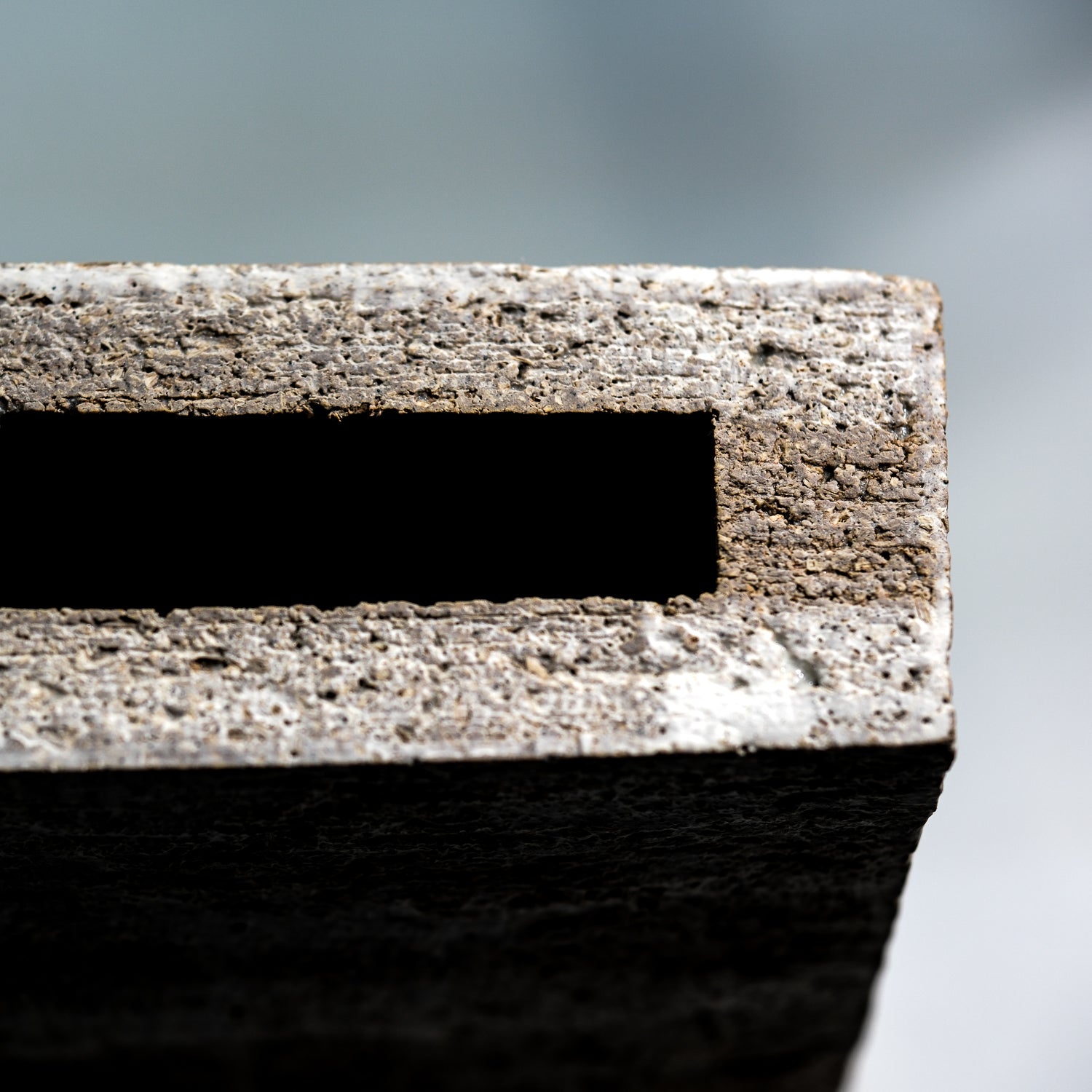 Über das Objekt: Christine Wagners querformatige Steinzeug Vase mit rauer Oberfläche ist ca. 18 cm hoch, 28 cm breit und 7 cm tief. Der Grundriss der gebauten Vase gibt die klare Form vor. Die gestalteten Platten sind mit weißen Engoben aus Kreide und Kaolin überzogen und scheinen zu atmen. Die flüssige Engobe wurde in waagerechten Pinselstrichen aufgetragen. Auf diese Weise entstanden die sichtbaren hellen Laufspuren auf der Oberfläche. Die Öffnung des Gefäßes ist seitlich versetzt, was der Grundform eine Besonderheit verleiht. Reduziert auf das Wesentliche überzeugen die Steinzeug Unikate von Christine Wagner durch ihre pure Schönheit.