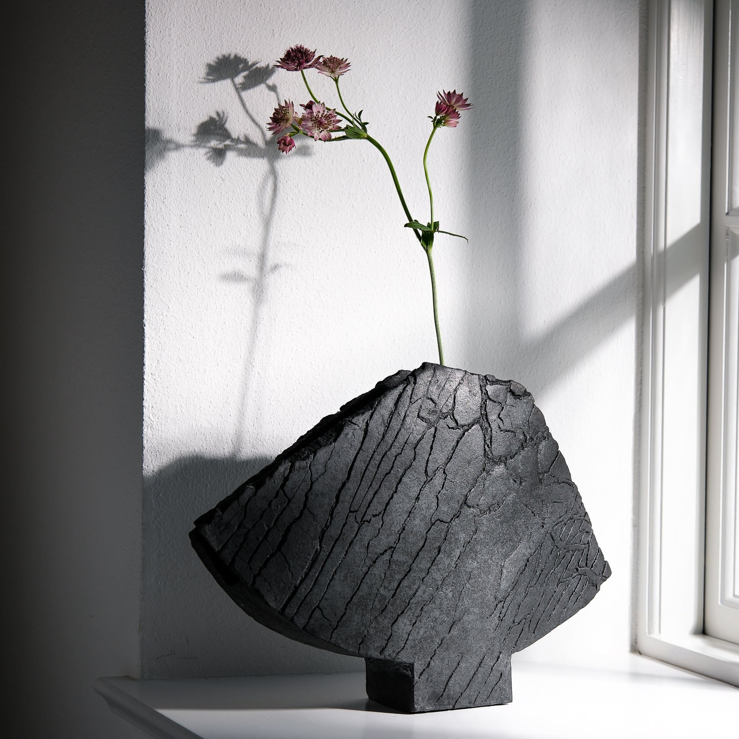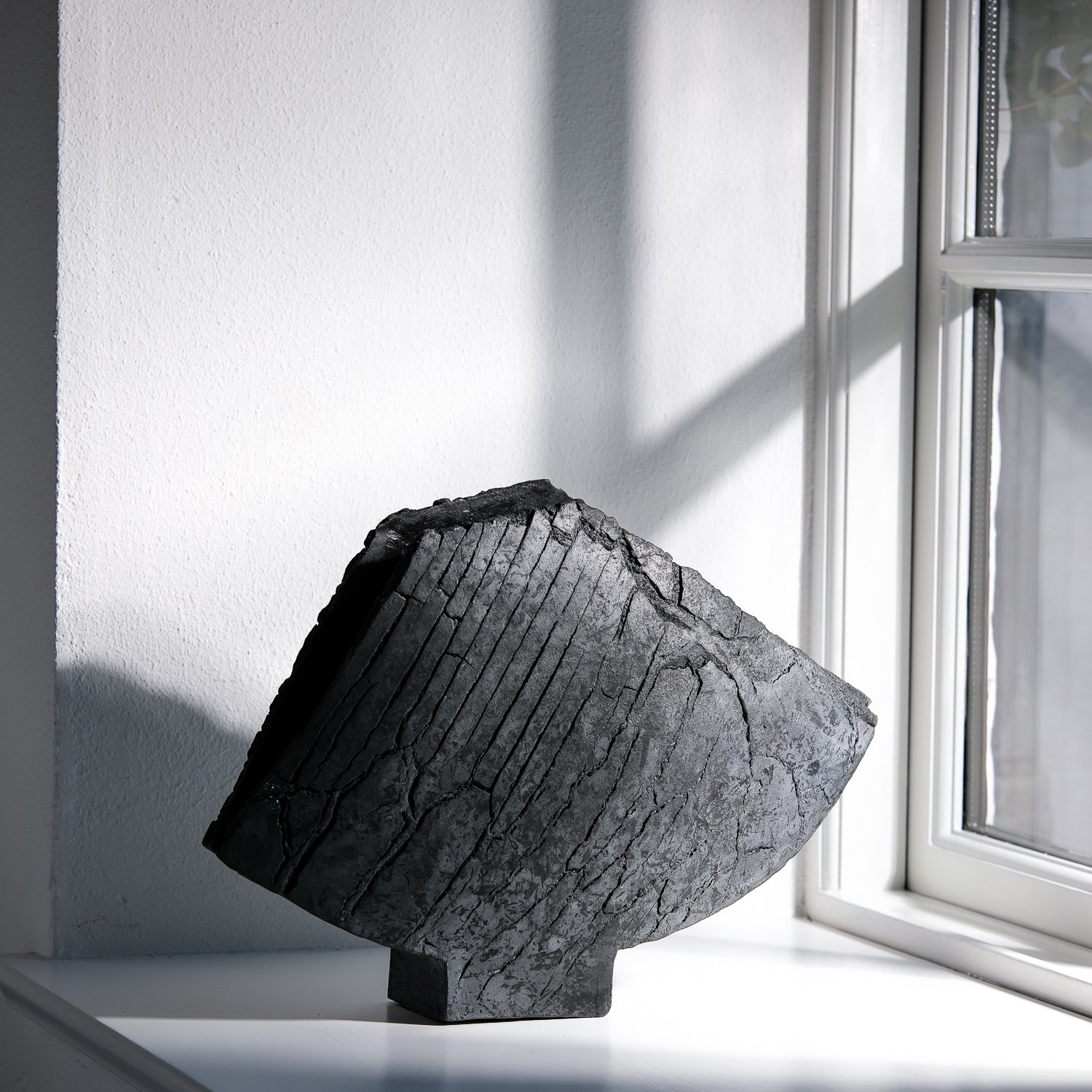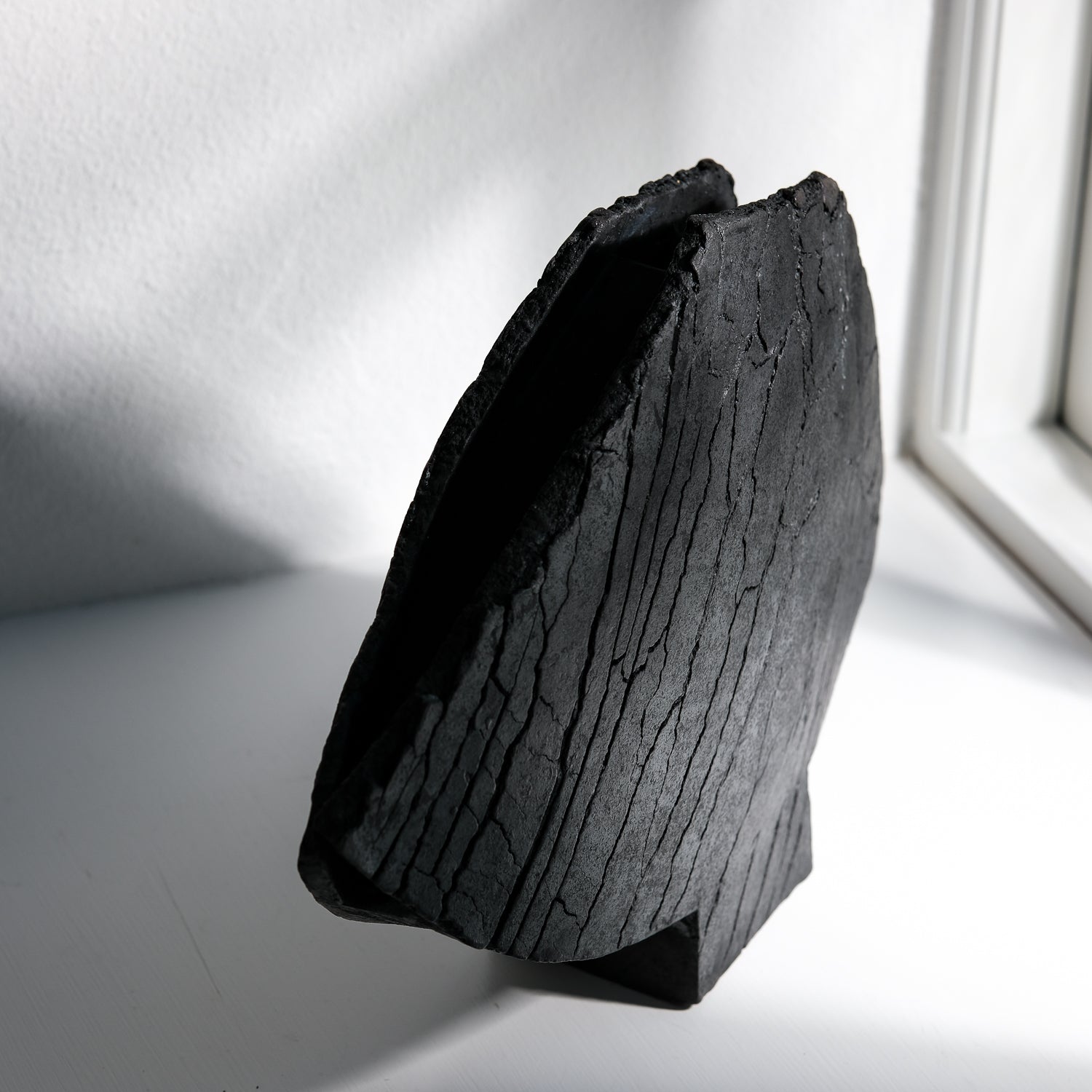 Über das Objekt: Gundula Sommerers asymmetrische pech-schwarzen Flügelvasen „stehen für sich“. Die in Aufbautechnik handgefertigten Objekte sind Unikate und bei Größen von bis zu 45cm Breite äußerst markant in ihrem Erscheinungsbild, bei sehr hohen Wiedererkennungswert. Durch den Einsatz des Raku-Verfahrens beim Brennen der Objekte entsteht Kohlenstoff, der in die Poren der Vase eindringt und die Stücke dauerhaft tiefschwarz färbt. Dieses Schwarz in Kombination mit den Rissen in der Oberfläche der Vase, führt zu einer einzigartigen Individualisierung der Oberflächenstruktur. Sowohl optisch als auch haptisch. Diese Flügelvase ist ca. 27cm hoch, an der breitesten Stelle ca. 40 cm breit und bis zu 7,5cm stark. Die Öffnung der wasserdichten Vase ist schmal, so dass das Objekt sich wunderbar für langstielige zarte Sträuße, Feld- und Kornblumen, Gräser oder einzelne Zweige eignet. Gundula Sommerer fertigt diese Vase in unterschiedlichen Größen in Kleinstserie.