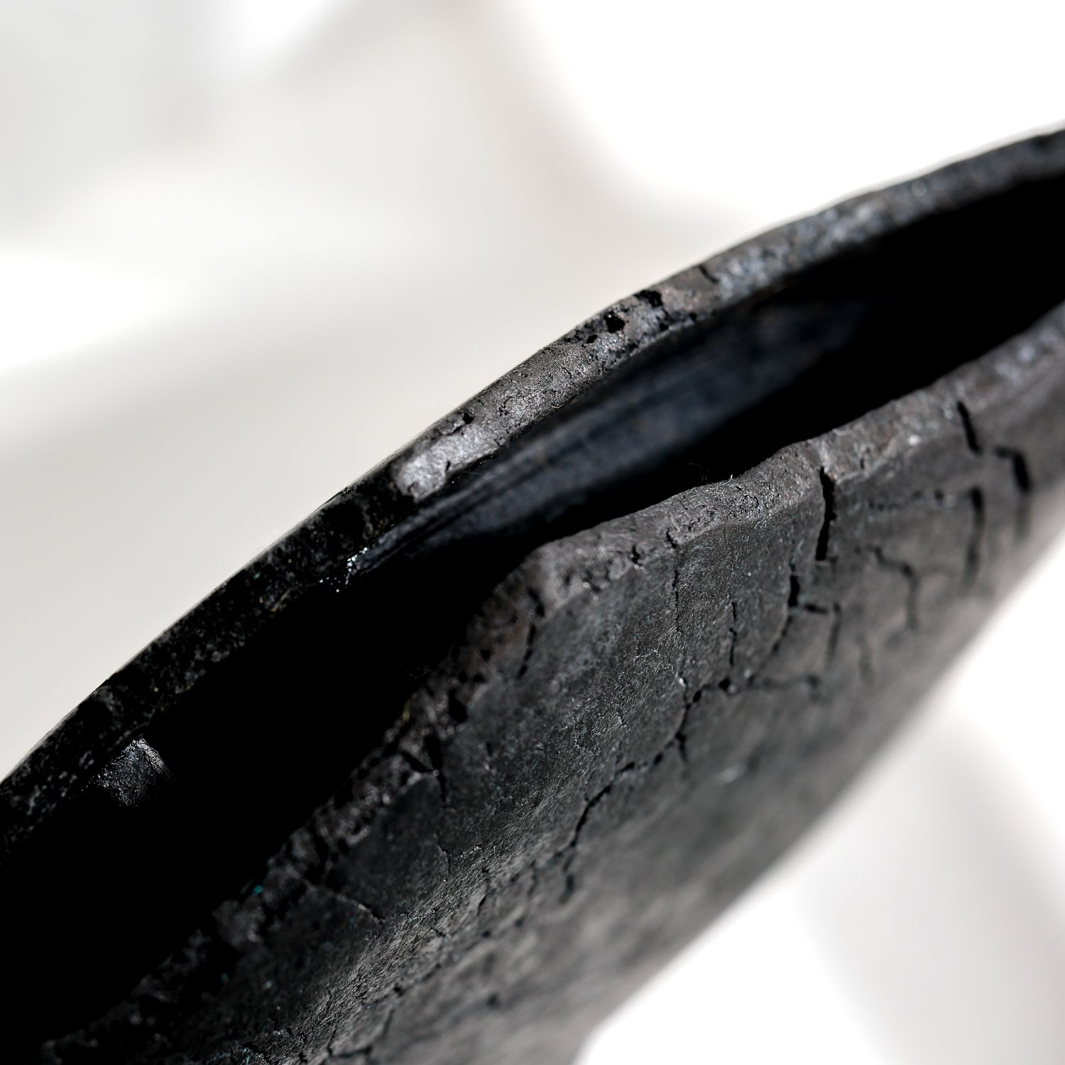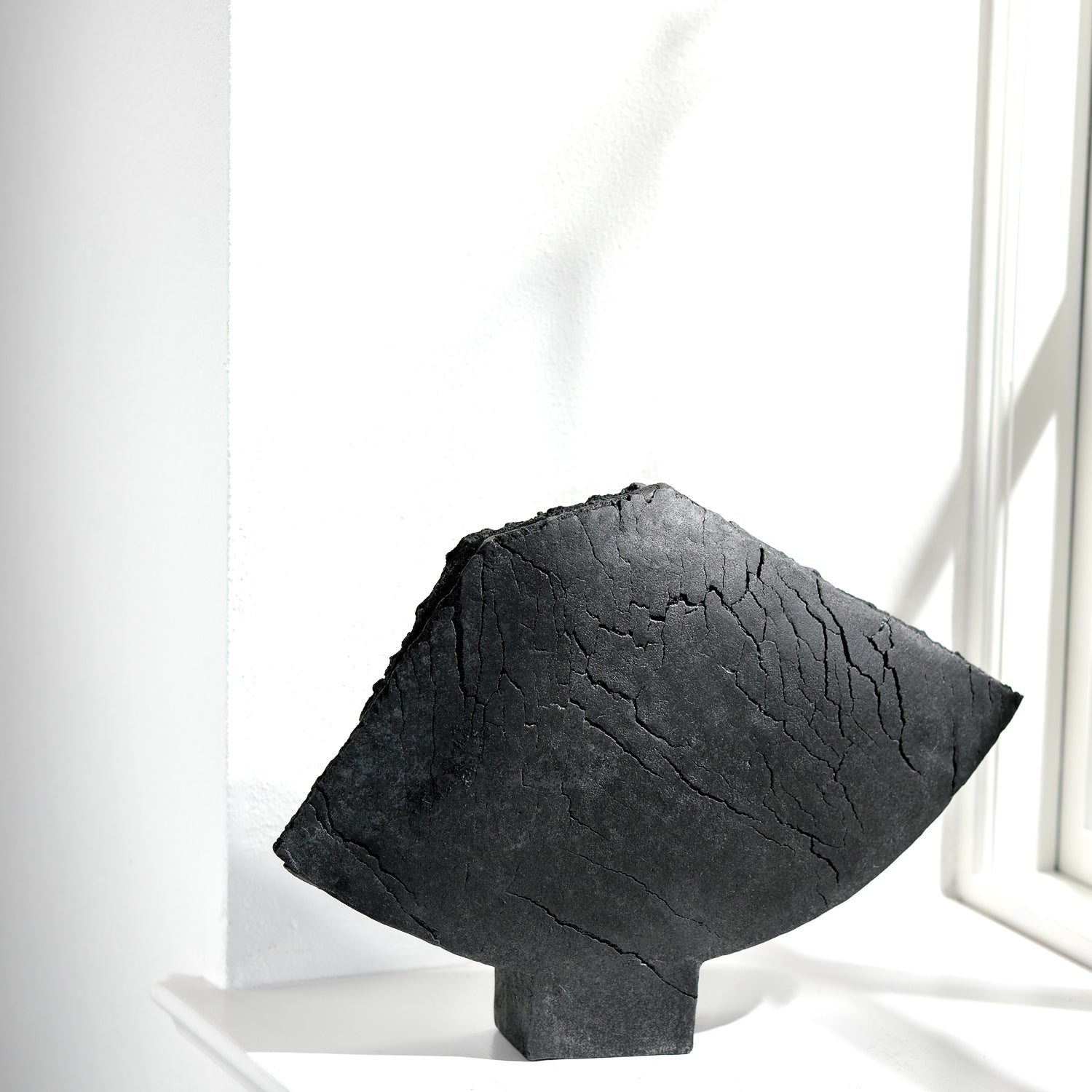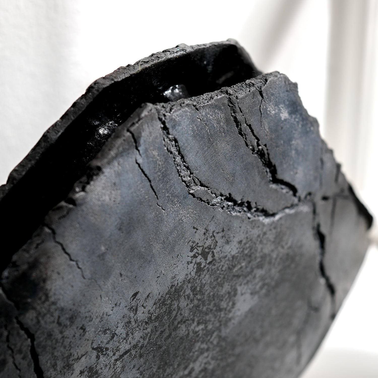 Über das Objekt: Gundula Sommerers asymmetrische pech-schwarzen Flügelvasen „stehen für sich“. Die in Aufbautechnik handgefertigten Objekte sind Unikate und bei Größen von bis zu 45cm Breite äußerst markant in ihrem Erscheinungsbild, bei sehr hohen Wiedererkennungswert. Durch den Einsatz des Raku-Verfahrens beim Brennen der Objekte entsteht Kohlenstoff, der in die Poren der Vase eindringt und die Stücke dauerhaft tiefschwarz färbt. Dieses Schwarz in Kombination mit den Rissen in der Oberfläche der Vase, führt zu einer einzigartigen Individualisierung der Oberflächenstruktur. Sowohl optisch als auch haptisch. Diese Flügelvase ist ca. 30 cm hoch, an der breitesten Stelle ca. 40 cm breit und bis zu 7 cm stark. Die Öffnung der wasserdichten Vase ist schmal, so dass das Objekt sich wunderbar für langstielige zarte Sträuße, Feld- und Kornblumen, Gräser oder einzelne Zweige eignet. Gundula Sommerer fertigt diese Vase in unterschiedlichen Größen in Kleinstserie.
