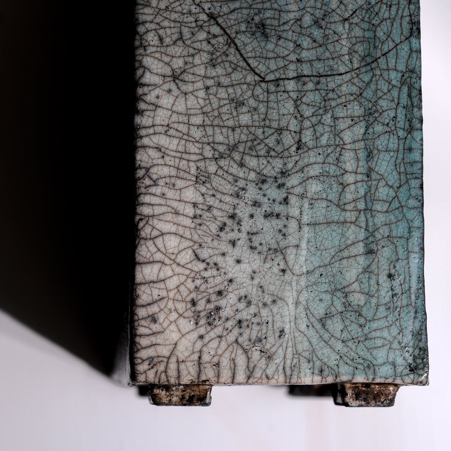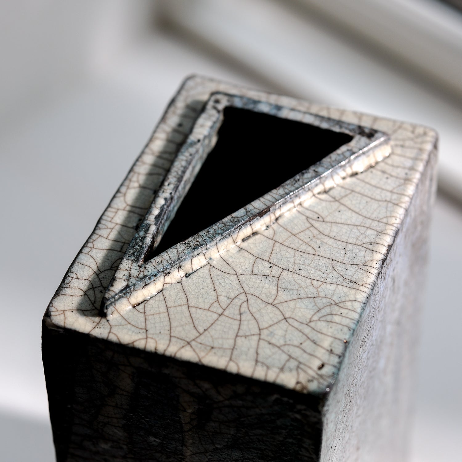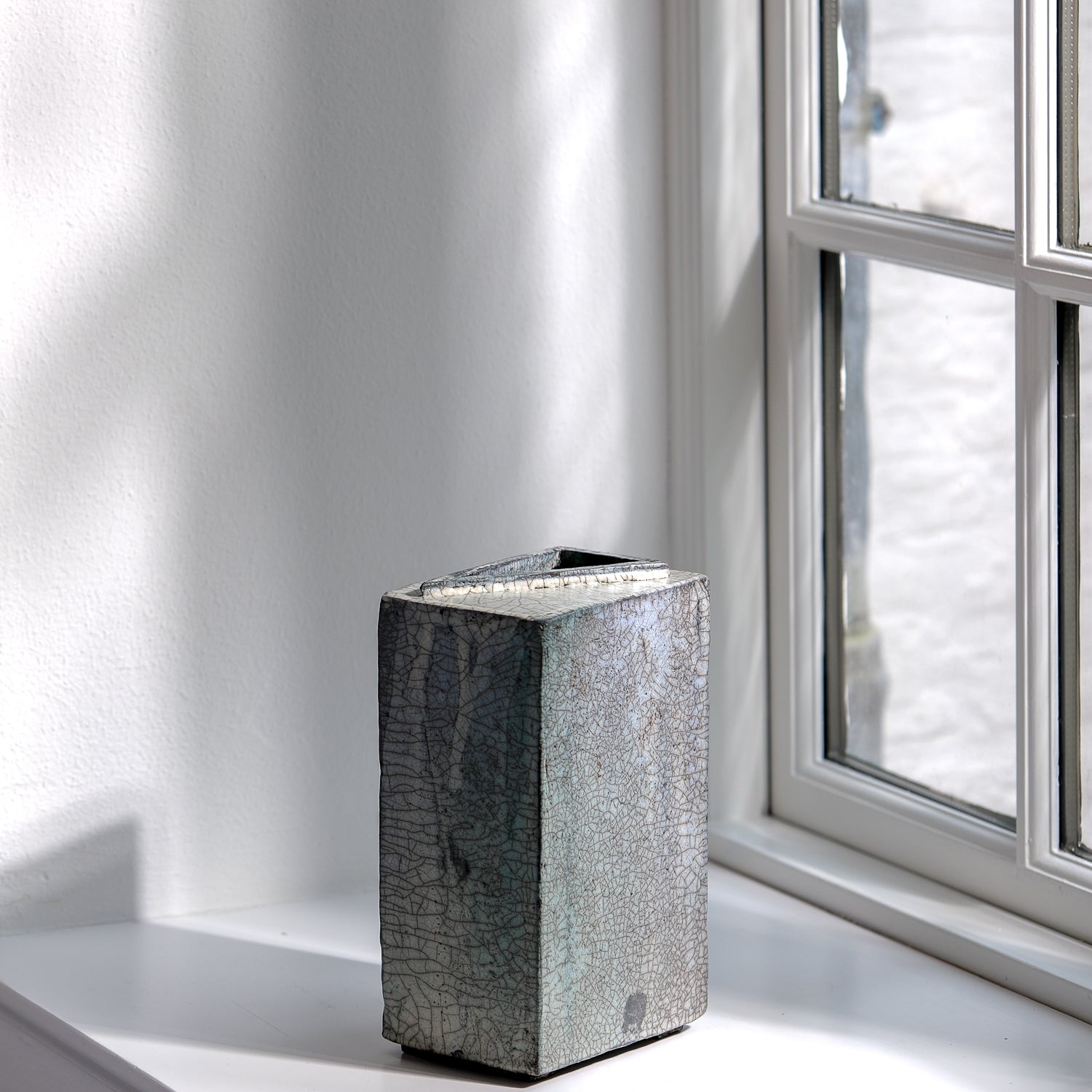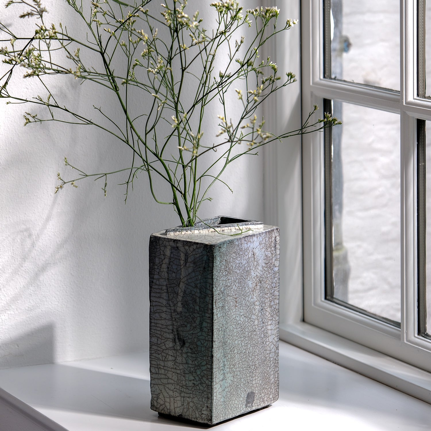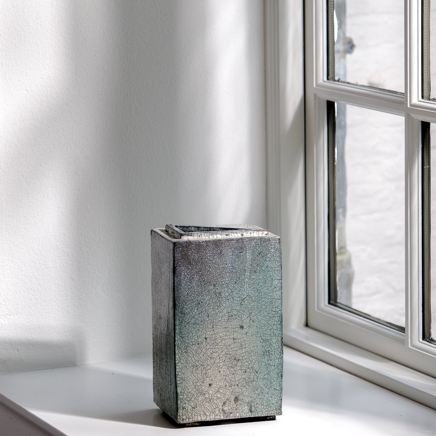 Über das Objekt: Diese blaugrüne, viereckige Vase aus Ton ist von Gundula Sommerer handgearbeitet und in Aufbautechnik mit Platten erstellt. Die schlichte Form der hohen Vase wird durch eine dreieckige Vasenöffnung auf der Oberseite des Objektes durchbrochen. Die Vase ist wasserdicht, ca. 26 cm hoch und ca. 15 cm x 11 cm breit. Die äußerst interessante und einzigartige Oberfläche des Unikats entsteht durch das Auftragen zweier verschiedener Engoben plus einer transparenten Glasur und dem anschließendem Raku Brand. Diese Vase ist in ihrer Erscheinung und Haptik ein Einzelstück, das Raku-Verfahren macht das Endergebnis in weiten Teilen unvorhersehbar. Gundula Sommerer fertigt diese Vase in Kleinstserie.