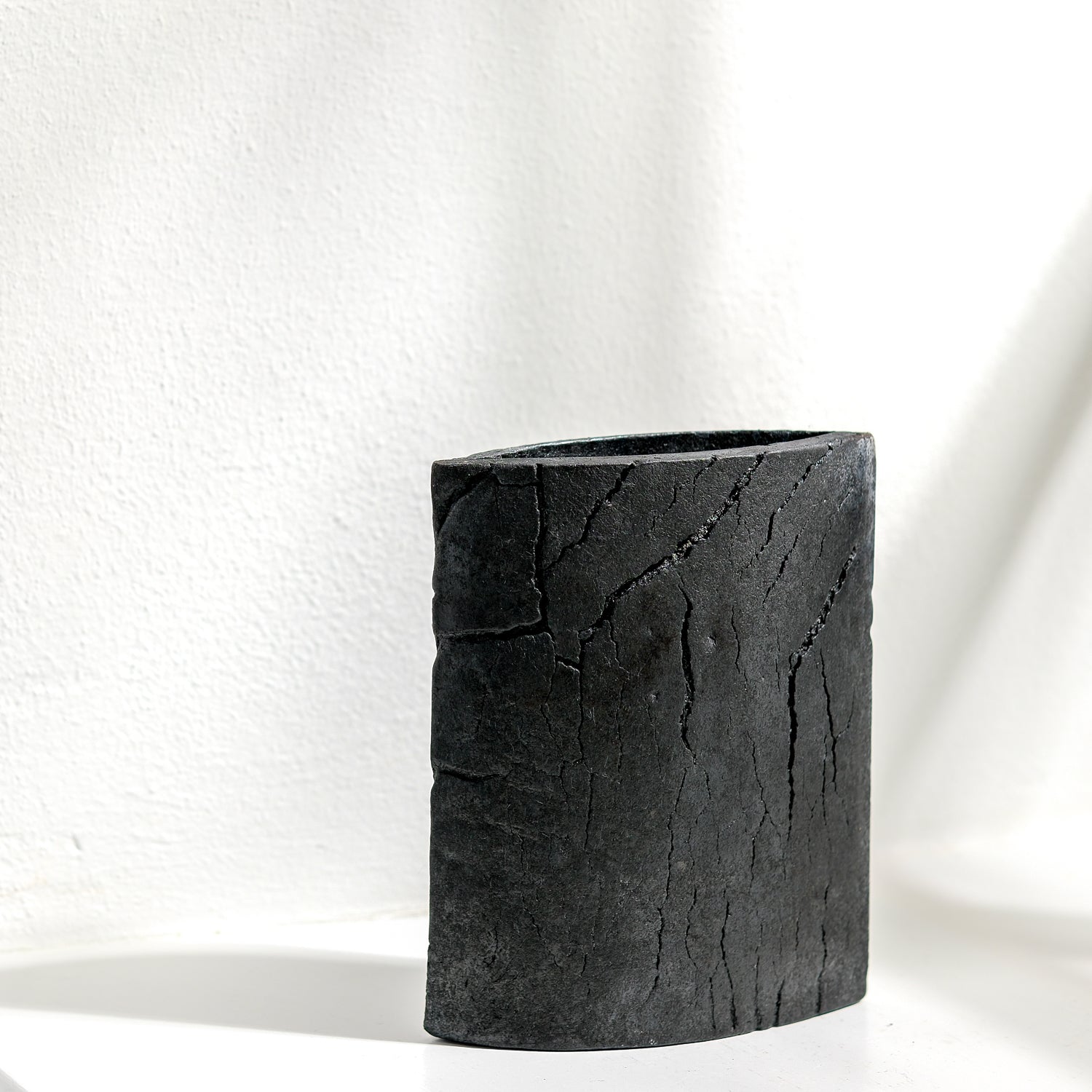 Über das Objekt: Gundula Sommerers ovale Raku Vasen sind in Aufbautechnik handgefertigt und jede ist ein Unikat. Durch den Einsatz des Raku-Verfahrens beim Brennen der Objekte entsteht Kohlenstoff, der in die Poren der Vase eindringt und die Stücke dauerhaft tiefschwarz färbt. Dieses Schwarz, in Kombination mit den Rissen in der Oberfläche der Vase, führt zu einer einzigartigen Individualisierung der Oberflächenstruktur. Sowohl optisch als auch haptisch. Diese Raku Vase ist ca. 18 cm hoch, 14 cm breit, 6 cm tief und wasserdicht. Sie eignet sich wunderbar für sowohl frische Sträuße, Feld- und Kornblumen, als auch für getrocknete Gräser oder Blumensträuße. Das tiefe Schwarz lässt Farben leuchten! Gundula Sommerer fertigt diese Vase in unterschiedlichen Größen in Kleinstserie.