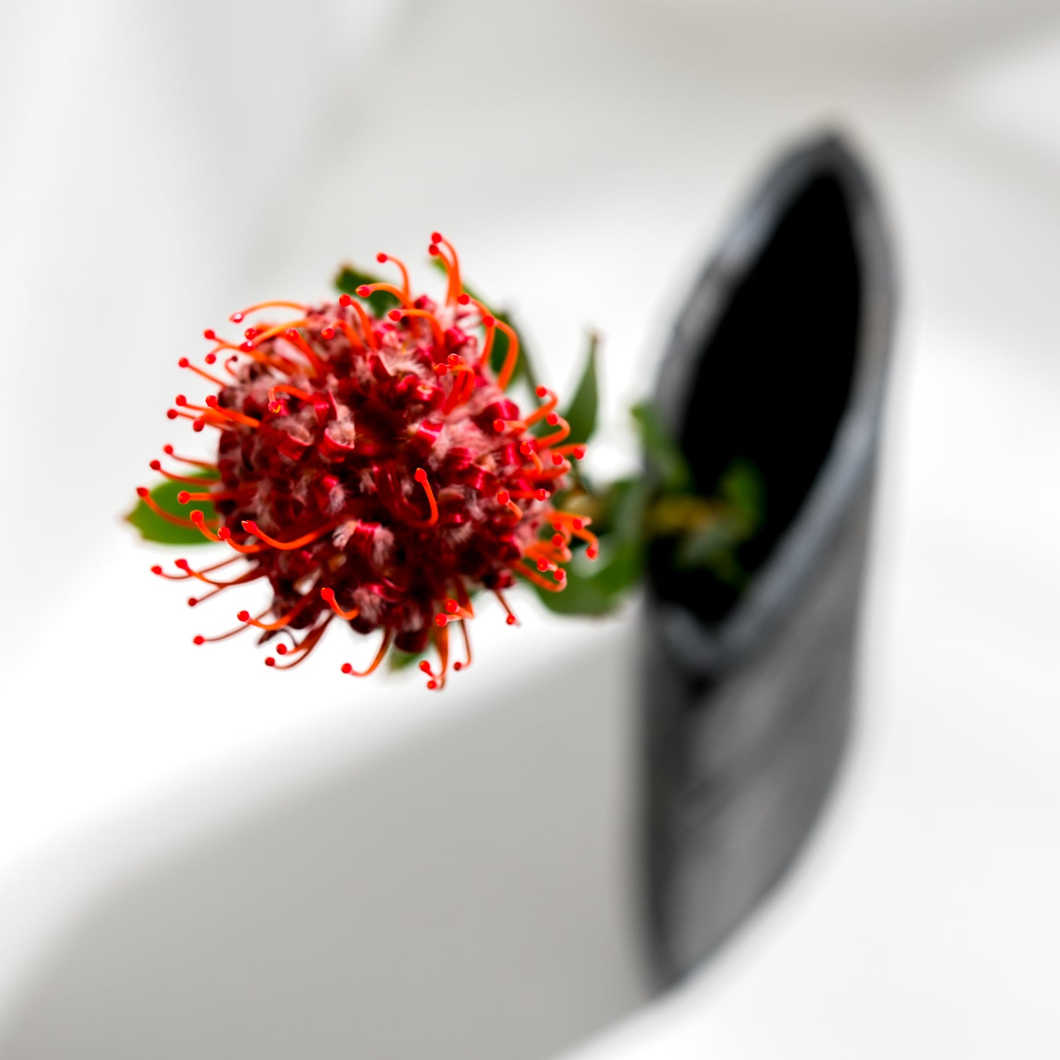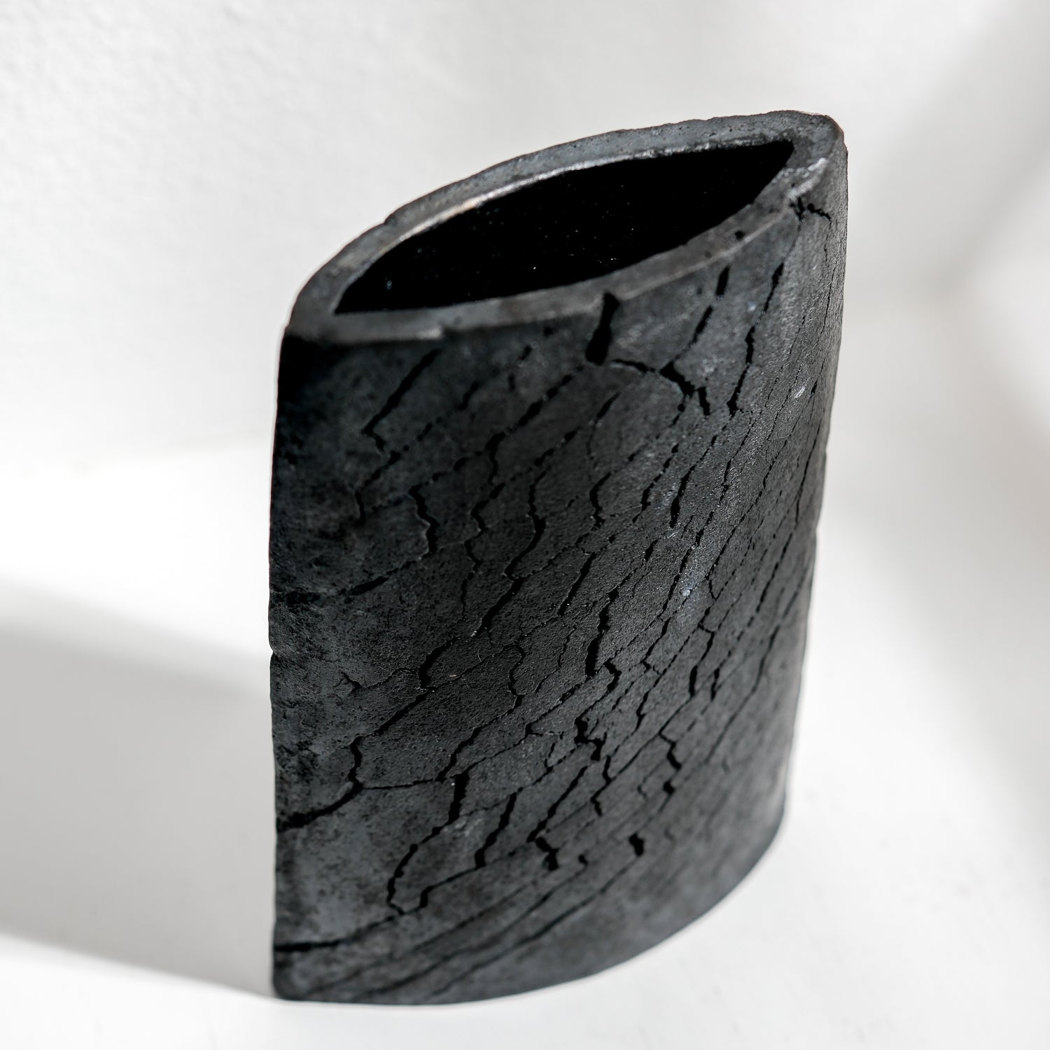 Über das Objekt: Gundula Sommerers ovale Raku Vasen sind in Aufbautechnik handgefertigt und jede ist ein Unikat. Durch den Einsatz des Raku-Verfahrens beim Brennen der Objekte entsteht Kohlenstoff, der in die Poren der Vase eindringt und die Stücke dauerhaft tiefschwarz färbt. Dieses Schwarz, in Kombination mit den Rissen in der Oberfläche der Vase, führt zu einer einzigartigen Individualisierung der Oberflächenstruktur. Sowohl optisch als auch haptisch. Diese Raku Vase ist ca. 20 cm hoch, 13 cm breit, 5 cm tief und wasserdicht. Sie eignet sich wunderbar für sowohl frische Sträuße, Feld- und Kornblumen, als auch für getrocknete Gräser oder Blumensträuße. Das tiefe Schwarz lässt Farben leuchten! Gundula Sommerer fertigt diese Vase in unterschiedlichen Größen in Kleinstserie.