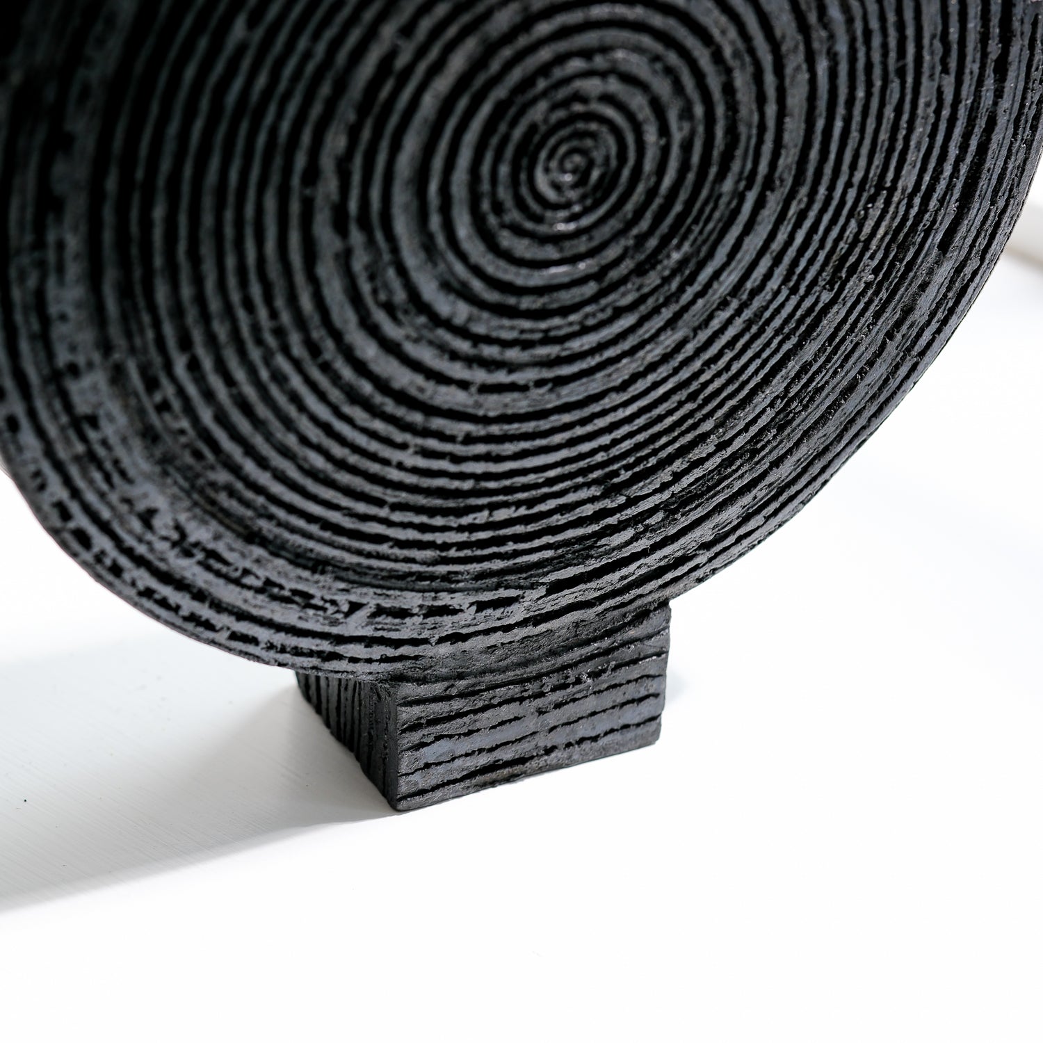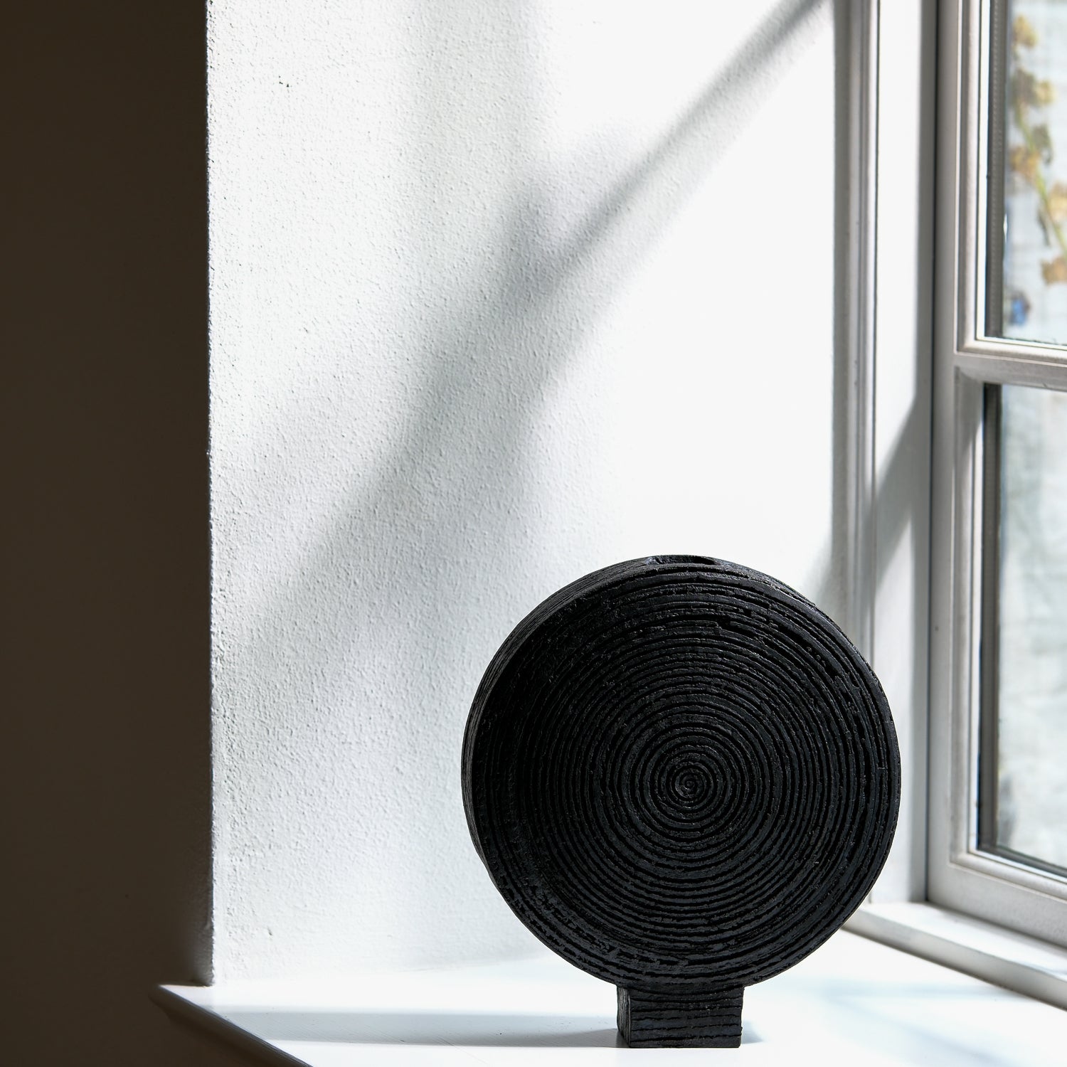Über das Objekt: Gundula Sommerers runde Raku Vasen sind wahre Blickfänger und in ihrer Erscheinung äußerst präsent. Die in Aufbautechnik handgefertigten Objekte sind Unikate und jede davon ist einzelnstehend oder in Kombination mit anderen Vasen oder Gefäßen bestens aufgehoben. Die Oberflächenstruktur, erzeugt durch das Einritzen einer Spirale, die sich jeweils über die gesamte Fläche der Seitenteile aufbaut, verleiht der Vase eine weitere Dimension.  Als Solitär stark, harmoniert das seidenmatte Schwarz der im Raku Verfahren gebrannten Vasen mit kräftigen, aber auch reduzierten Farben und gibt Blumen, Gräsern oder Zweigen eine grandiose Bühne. Die Raku Vase hat einen Durchmesser von ca. 26 cm, eine Gesamthöhe von 29 cm und ist ca. 5 cm tief. Durch das hohe Eigengewicht, ca. 2,4 kg, steht die Vase stabil. Sie ist wasserdicht und Teil einer Kleinstserie und auch in anderen Größen erhältlich.