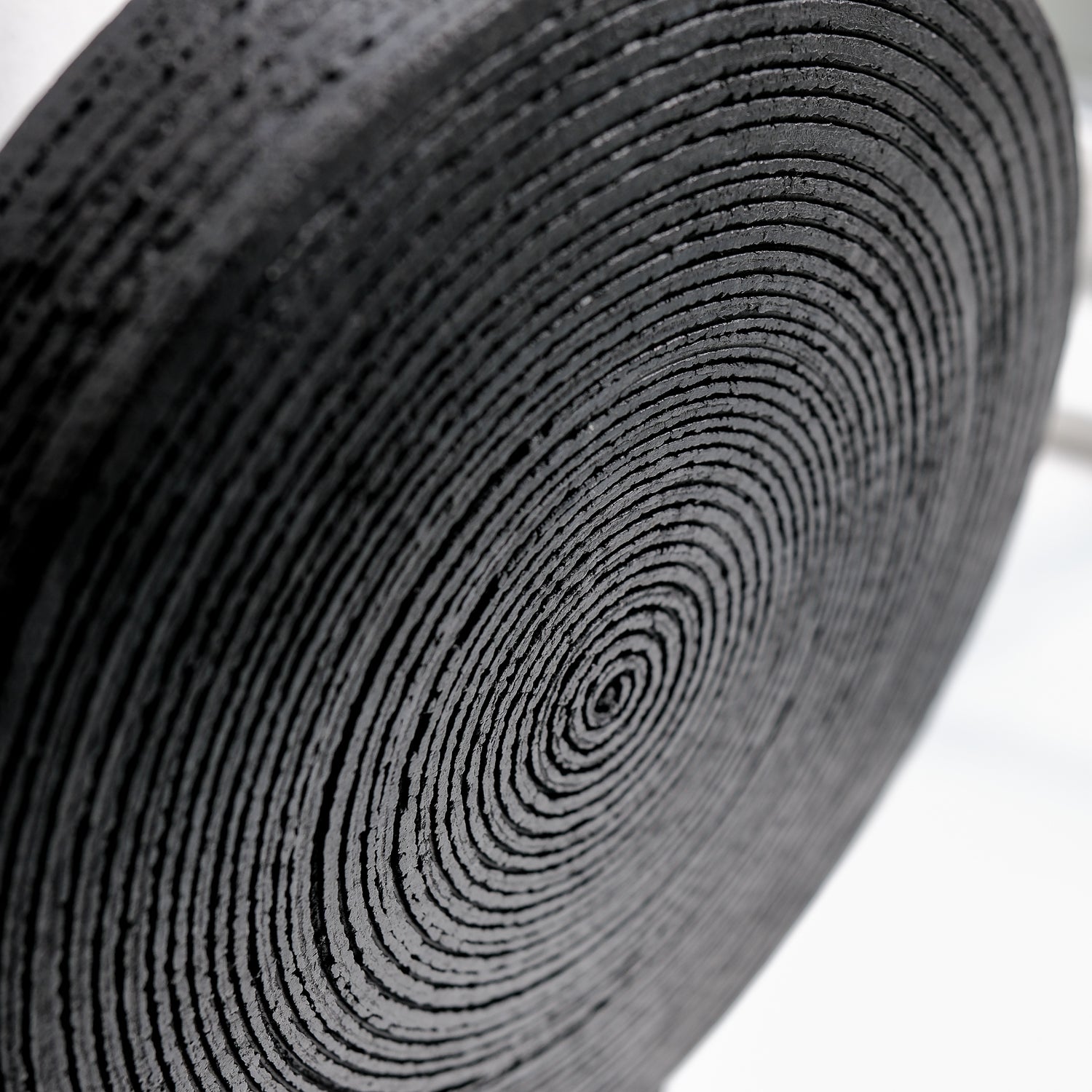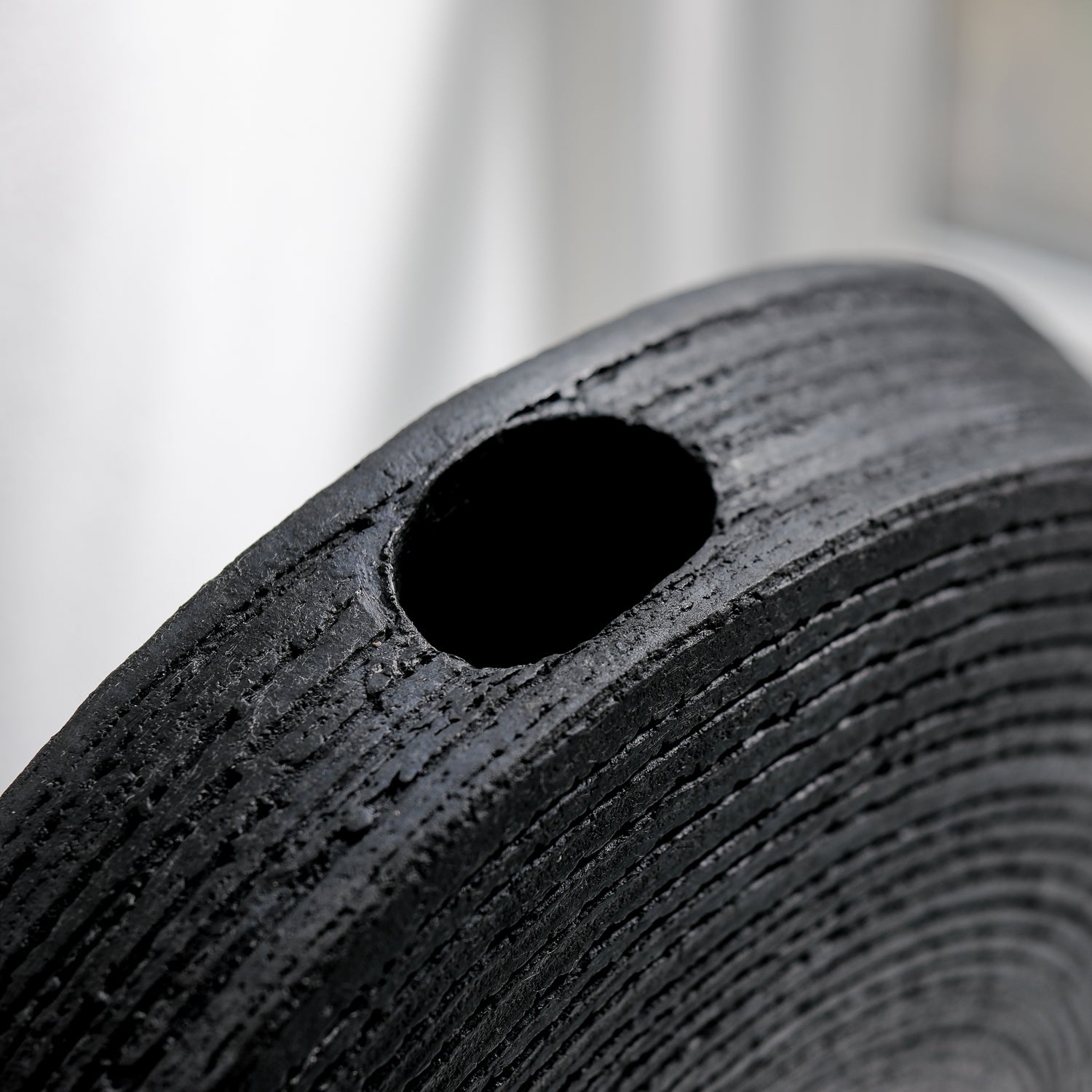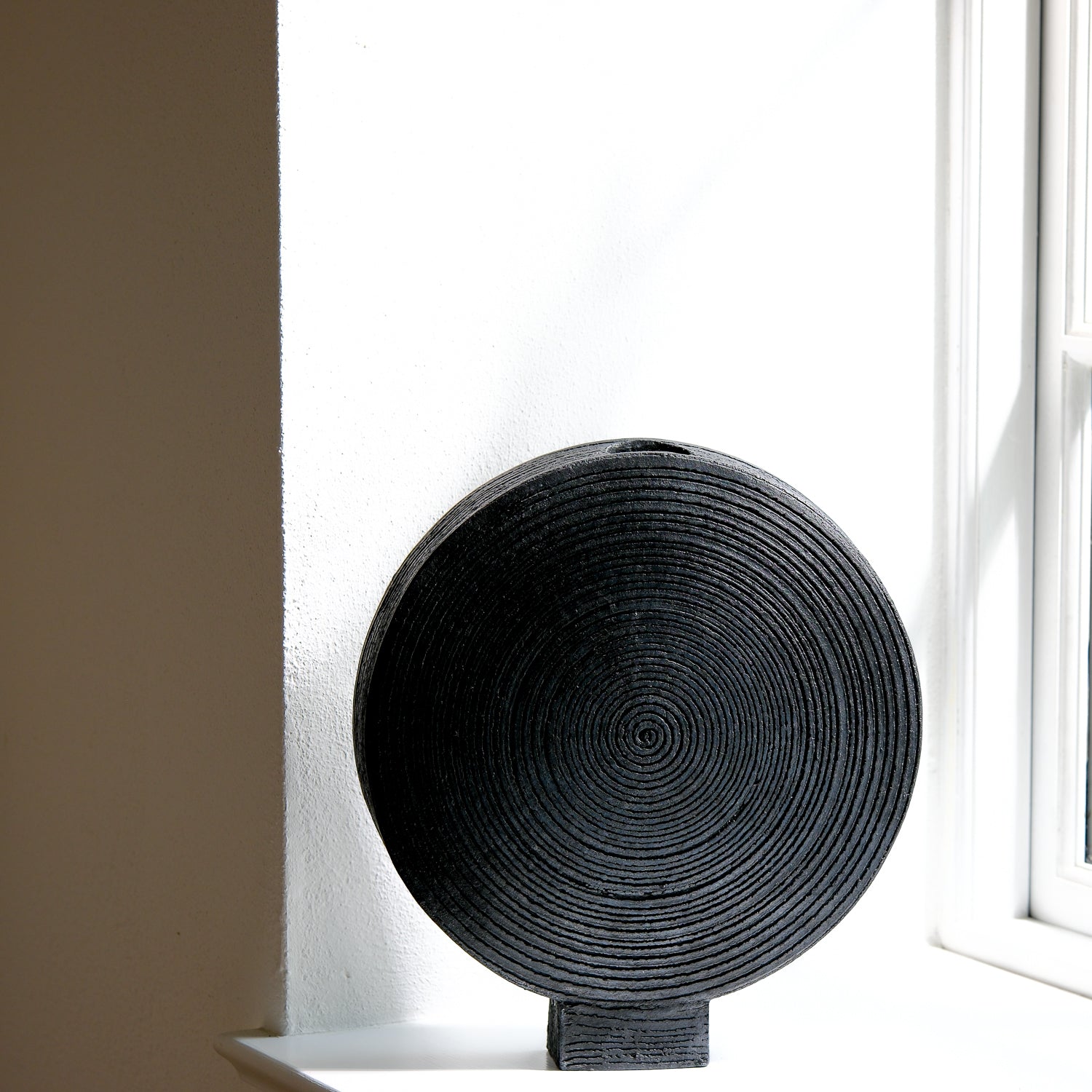 Über das Objekt: Gundula Sommerers runde Raku Vasen sind wahre Blickfänger und in ihrer Erscheinung äußerst präsent. Die in Aufbautechnik handgefertigten Objekte sind Unikate und jede davon ist einzelnstehend oder in Kombination mit anderen Vasen oder Gefäßen bestens aufgehoben. Die Oberflächenstruktur, erzeugt durch das Einritzen einer Spirale, die sich jeweils über die gesamte Fläche der Seitenteile aufbaut, verleiht der Vase eine weitere Dimension. Als Solitär stark, harmoniert das seidenmatte Schwarz der im Raku Verfahren gebrannten Vasen mit kräftigen, aber auch reduzierten Farben und gibt Blumen, Gräsern oder Zweigen eine grandiose Bühne. Die Raku Vase hat einen Durchmesser von ca. 30 cm, eine Gesamthöhe von 35 cm und ist ca. 6 cm tief. Durch das hohe Eigengewicht, ca. 3,5 kg, steht die Vase stabil. Sie ist wasserdicht und Teil einer Kleinstserie und auch in anderen Größen erhältlich.