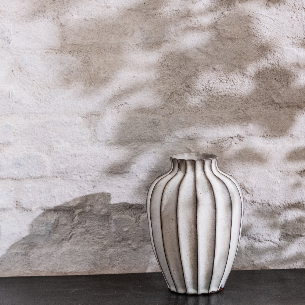 Über das Objekt: Yumiko Shimoyas Vase #06 ist ca. 13 cm hoch und hat einen Durchmesser von 11 cm. Die runde Form dieser Vase aus japanischen Ton wirkt durch die Shinogi Verzierung äußerst elegant. Die hell glasierte Vase ist wasserdicht, steht gerne alleine, aber auch in der Gruppe mit anderen schönen Vasen und ist auf Grund ihrer Form und Eleganz ideal für einzelne Blumen oder Zweige, trocken oder frisch, geeignet.