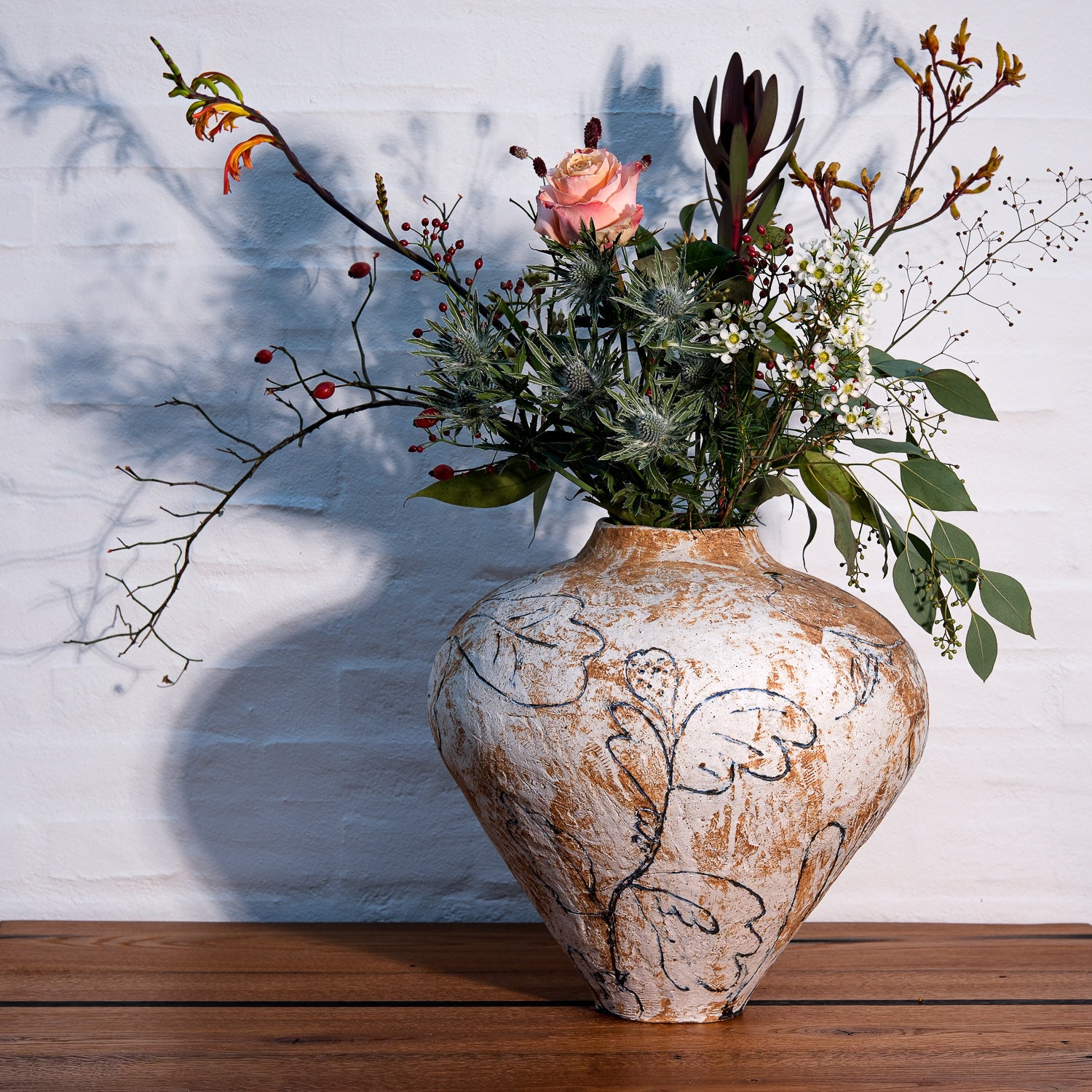 Über das Objekt: Die Steinzeugvase von Lotte Buur überzeugt durch ihre lebendige Gestaltung und die sorgfältige handwerkliche Ausführung. Ihre rustikale Textur harmoniert elegant mit den fantasievollen Blumenmotiven. Die runden Formen mit dezenten Asymmetrien verleihen der Vase eine geschwungene und individuelle Erscheinung. Mit einer Höhe von ca. 35 cm und einem Durchmesser von ca. 40 cm lässt sich die Vase flexibel sowohl als Tischvase als auch als Bodenvase einsetzen. Der leicht verjüngte Boden verleiht dem Objekt zusätzlich eine elegante Leichtigkeit. Die Kombination aus handwerklicher Technik, künstlerischem Dekor und funktionaler Gestaltung macht diese Vase zu einem einzigartigen Kunstobjekt und Blickfang in jedem Raum.