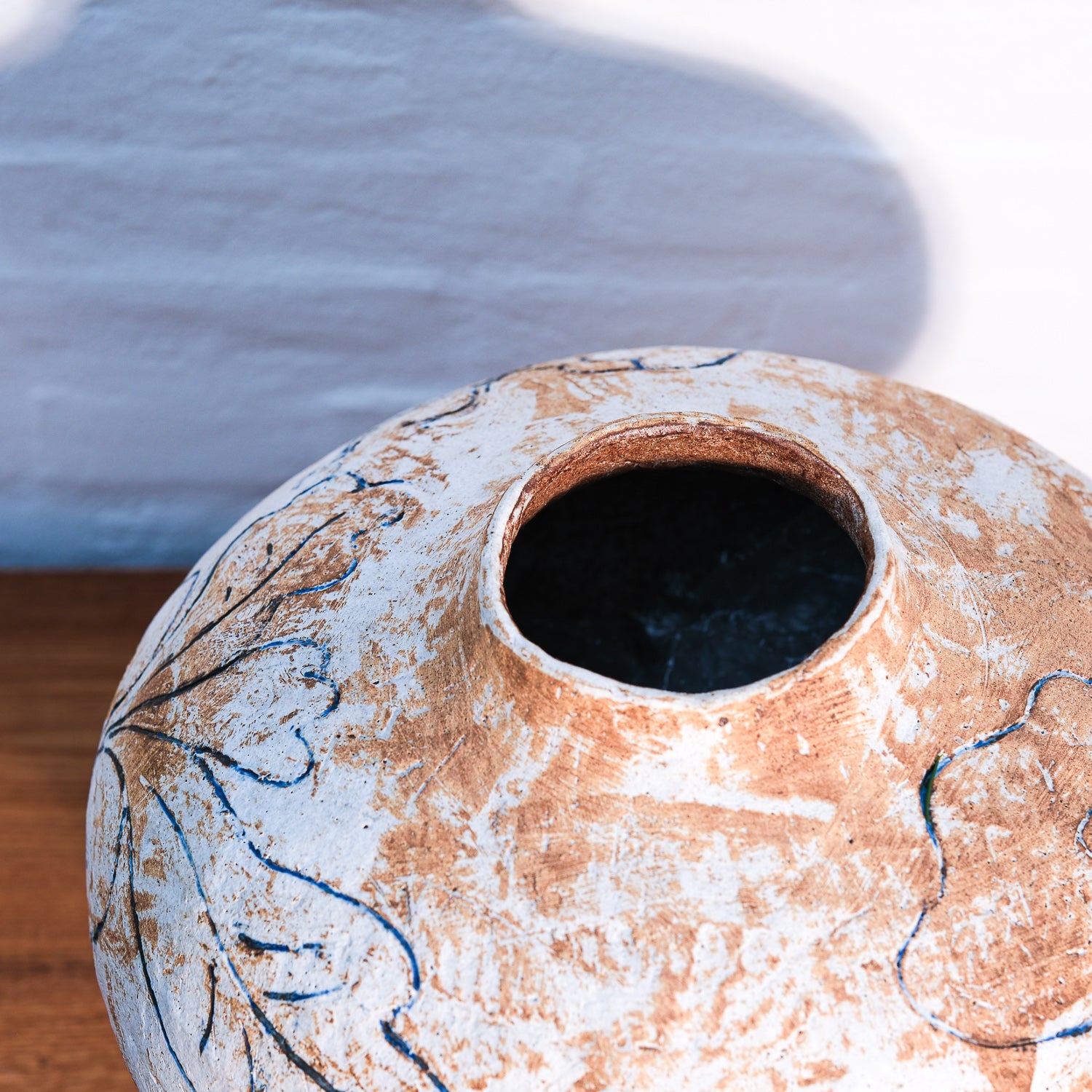Herstellungsverfahren: Die Vase wurde in Plattenbautechnik aus grobem Schamott-Steinzeugton gefertigt. Die Formen entstehen dabei durch das sorgfältige Zusammenfügen und Modellieren der ausgerollten Tonplatten. Die fantasievollen Blumenmotive wurden mit Kobaltoxid aufgemalt. Die Oberfläche ist veredelt durch eine weiße Sinterengobe, die die Struktur hervorhebt und dem Gefäß Plastizität verleiht. Das Innere der Vase ist weiß glasiert und dadurch wasserundurchlässig.