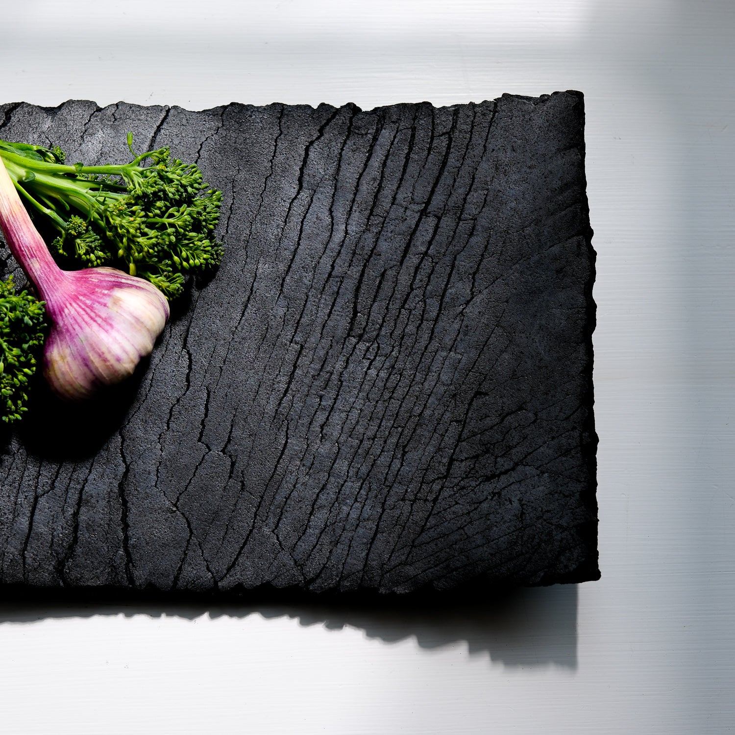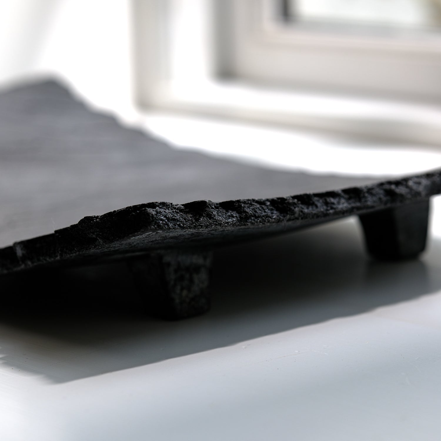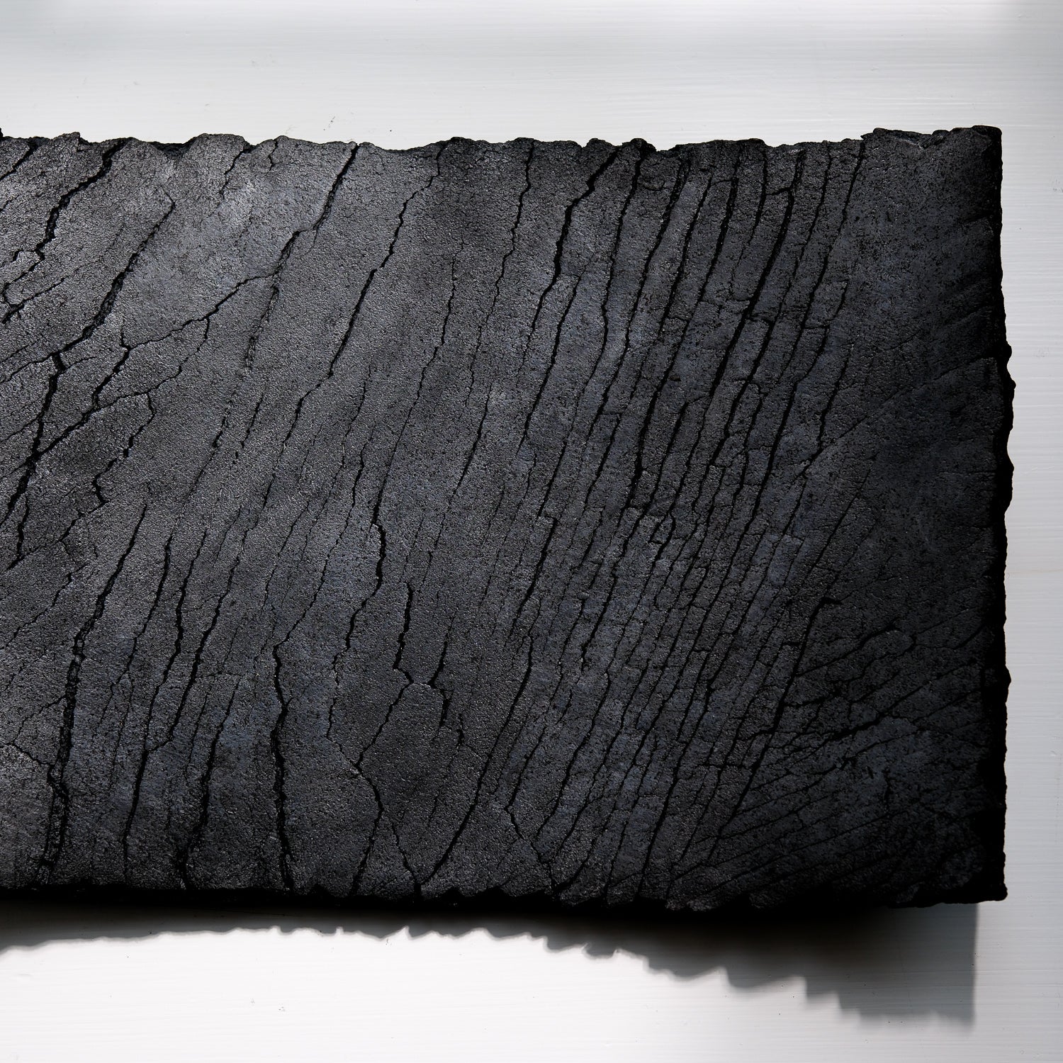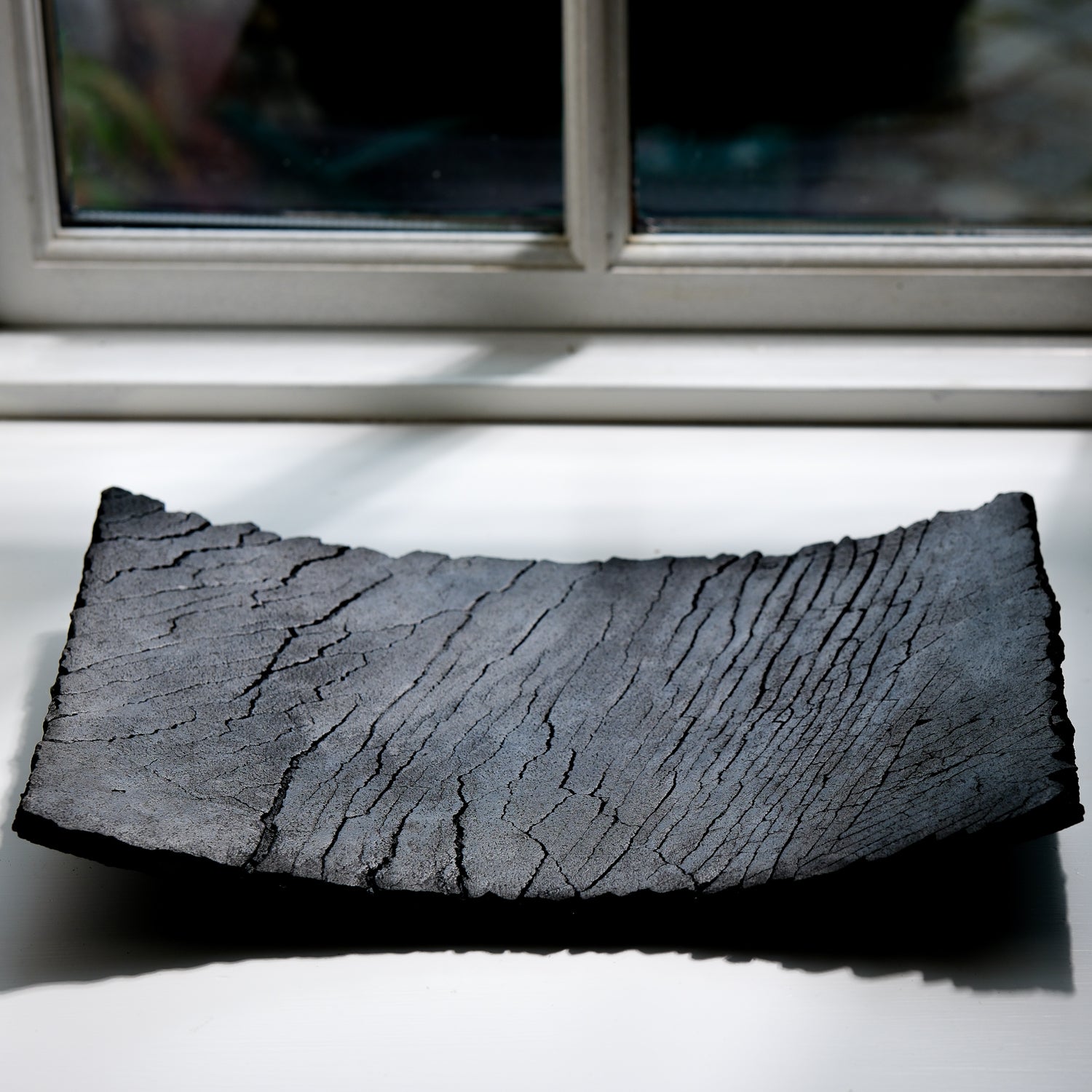 Über das Objekt: Gundula Sommerers schwarze Raku Schalen sind alles andere als gewöhnlich. Die in Aufbautechnik handgefertigten Objekte sind Unikate und jede Schale dieser Kleinstserie unterscheidet sich entweder in Form, Größe oder Oberflächenstruktur. Durch den Einsatz des Raku-Verfahrens beim Brennen der Objekte entsteht Kohlenstoff, der in die Poren der Schale eindringt und die Stücke dauerhaft tiefschwarz färbt. Dieses Schwarz in Kombination mit den Rissen in der Oberfläche der Schale, führt zu einer einzigartigen Individualisierung der Oberflächenstruktur. Sowohl optisch als auch haptisch. Das seidenmatte Tiefschwarz der Schalen harmoniert sowohl mit kräftigen, aber auch reduzierten Farben und bietet darin abgelegten Dingen eine grandiose Bühne. Diese Raku Schale ist mit Antikwachs poliert. Dadurch wird die Oberfläche unempfindlicher und leicht wasserabweisend. Trockene Lebensmittel könnten auf der Schale präsentiert werden, obwohl die Schale sich besser für Schlüssel oder Dinge eignet, die einem lieb und teuer sind. Die Schale hat eine Größe von ca. 37cm x 23cm und ist ca. 1760gr schwer. Sie ist Teil einer Kleinstserie und auch in anderen Größen und Formen erhältlich.