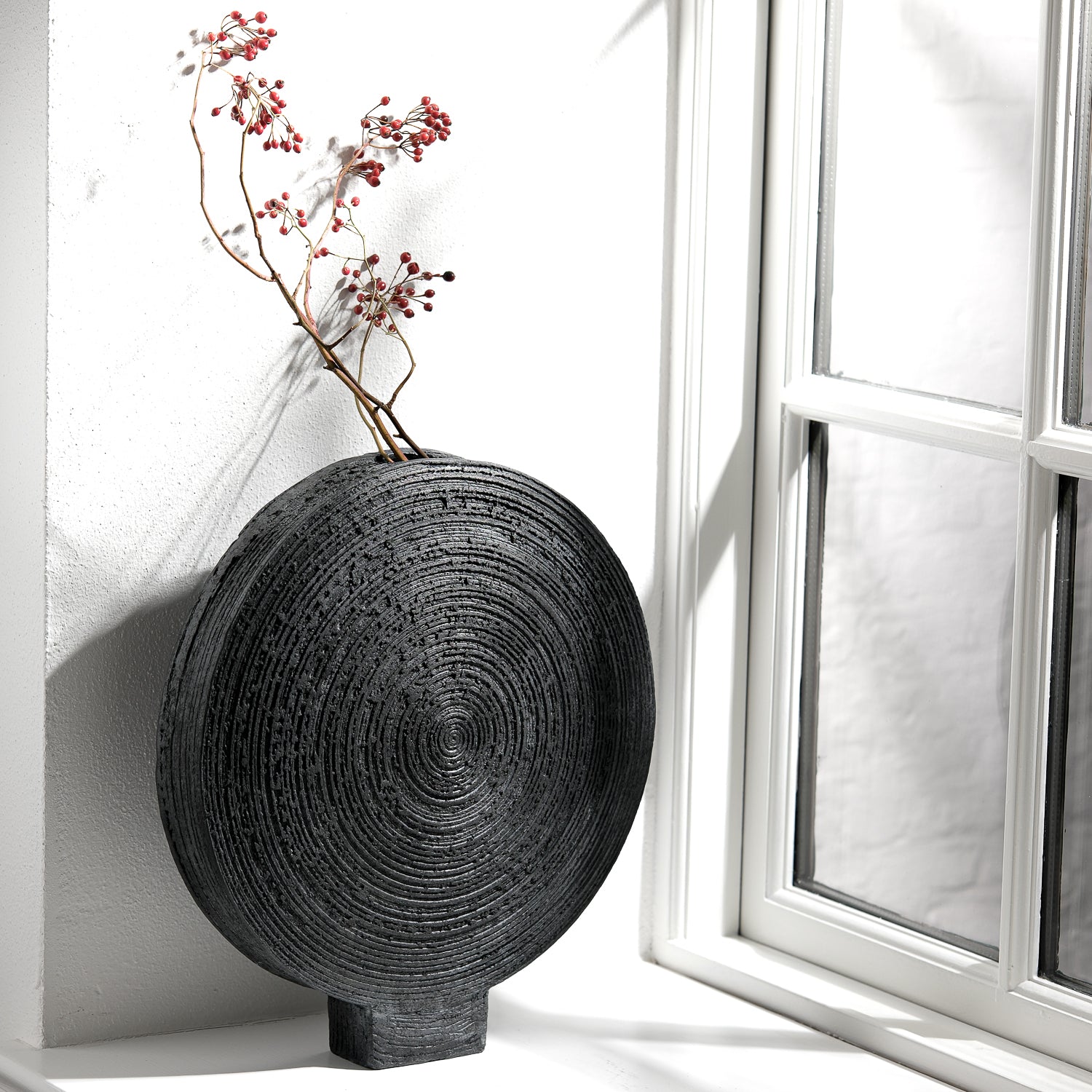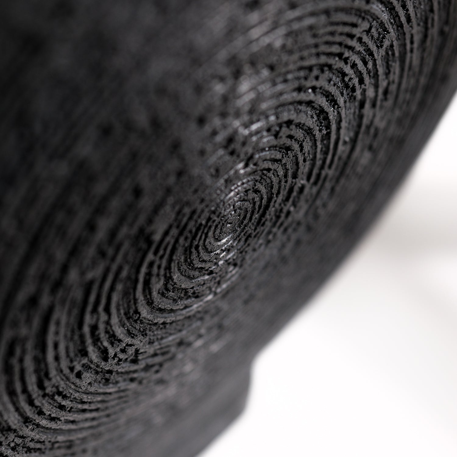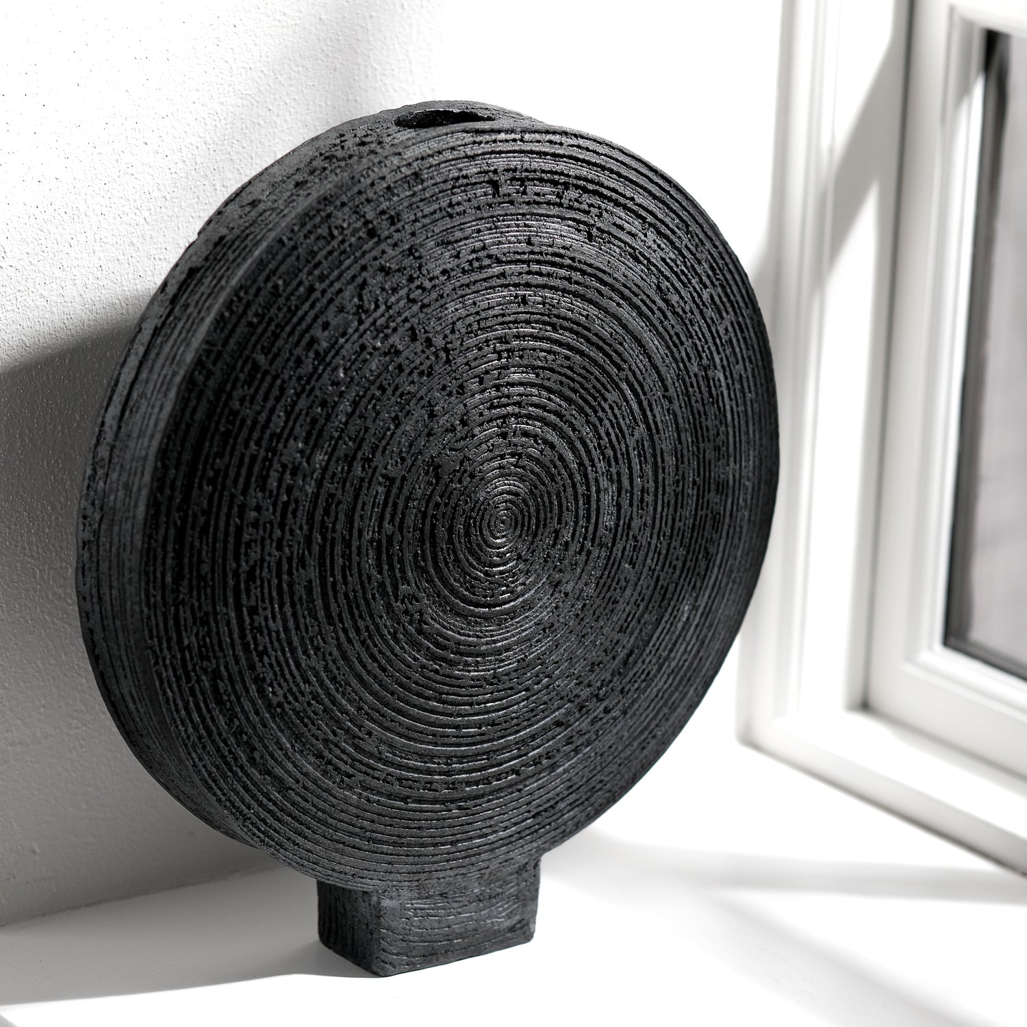 Über das Objekt: Gundula Sommerers runde Raku Vasen sind wahre Blickfänger und in ihrer Erscheinung äußerst präsent. Die in Aufbautechnik handgefertigten Objekte sind Unikate und jede davon ist einzelnstehend oder in Kombination mit anderen Vasen oder Gefäßen bestens aufgehoben. Die Oberflächenstruktur, erzeugt durch das Einritzen einer Spirale, die sich jeweils über die gesamte Fläche der Seitenteile aufbaut, verleiht der Vase eine weitere Dimension. Als Solitär stark, harmoniert das seidenmatte Schwarz der im Raku Verfahren gebrannten Vasen mit kräftigen, aber auch reduzierten Farben und gibt Blumen, Gräsern oder Zweigen eine grandiose Bühne. Die Raku Vase hat einen Durchmesser von ca. 34 cm, eine Gesamthöhe von 37 cm und ist ca. 5 cm breit. Durch das hohe Eigengewicht, ca. 5 kg, steht die Vase stabil. Sie ist wasserdicht und Teil einer Kleinstserie und auch in anderen Größen erhältlich.