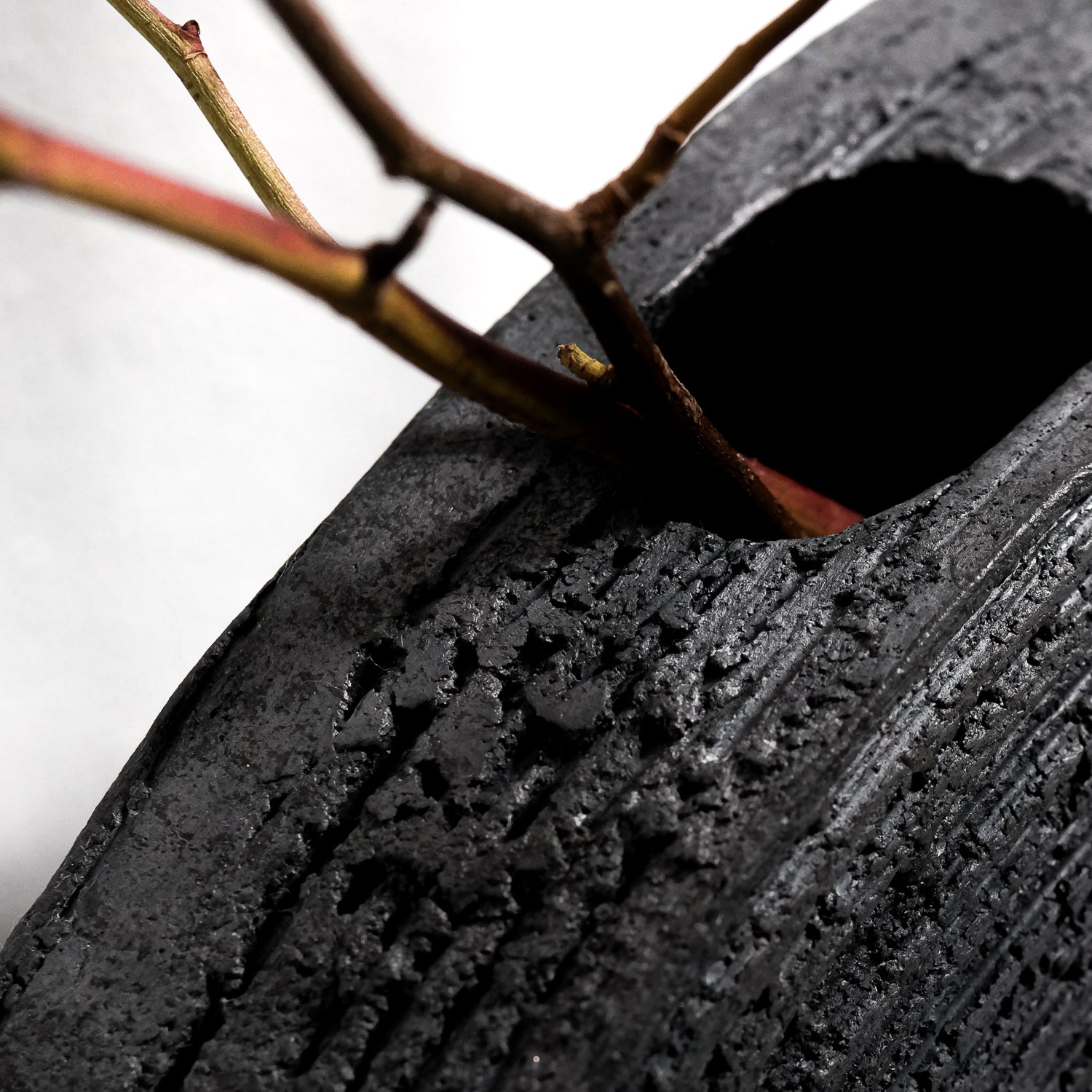 Herstellungsverfahren: Diese Keramikvase aus Ton ist in Aufbautechnik mit Platten handgefertigt. Die Vase ist nicht glasiert und im Raku-Verfahren gebrannt. Bei diesem Verfahren findet der erste Brand der Vase bei 920°C im Elektroofen statt, der zweite Brand bei ca. 1040°C im Gasofen. Die Vase wird dem Ofen noch glühend entnommen und kommt glühend in eine Kiste mit brennbarem Material. In dieser Kiste brennt sie über Stunden bei reduzierter Atmosphäre weiter. Nach Abkühlung wird sie mit Antikwachs von außen poliert und von innen mit einem speziellen Dichtungsmittel wasserdicht gemacht.