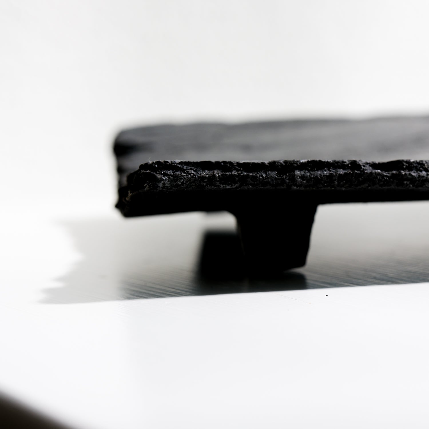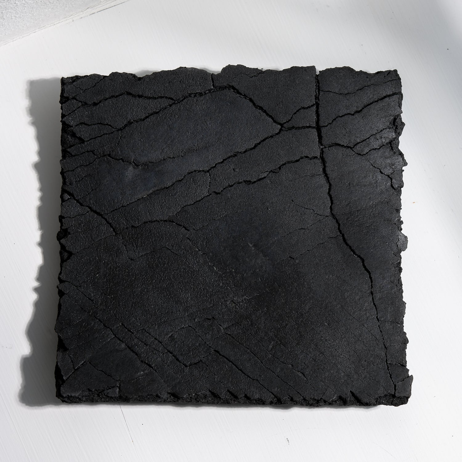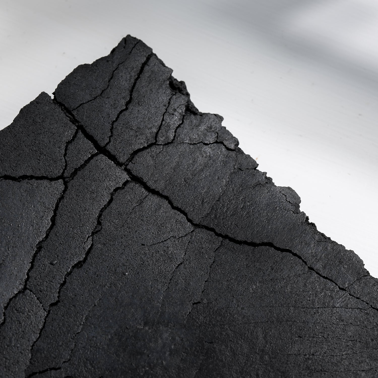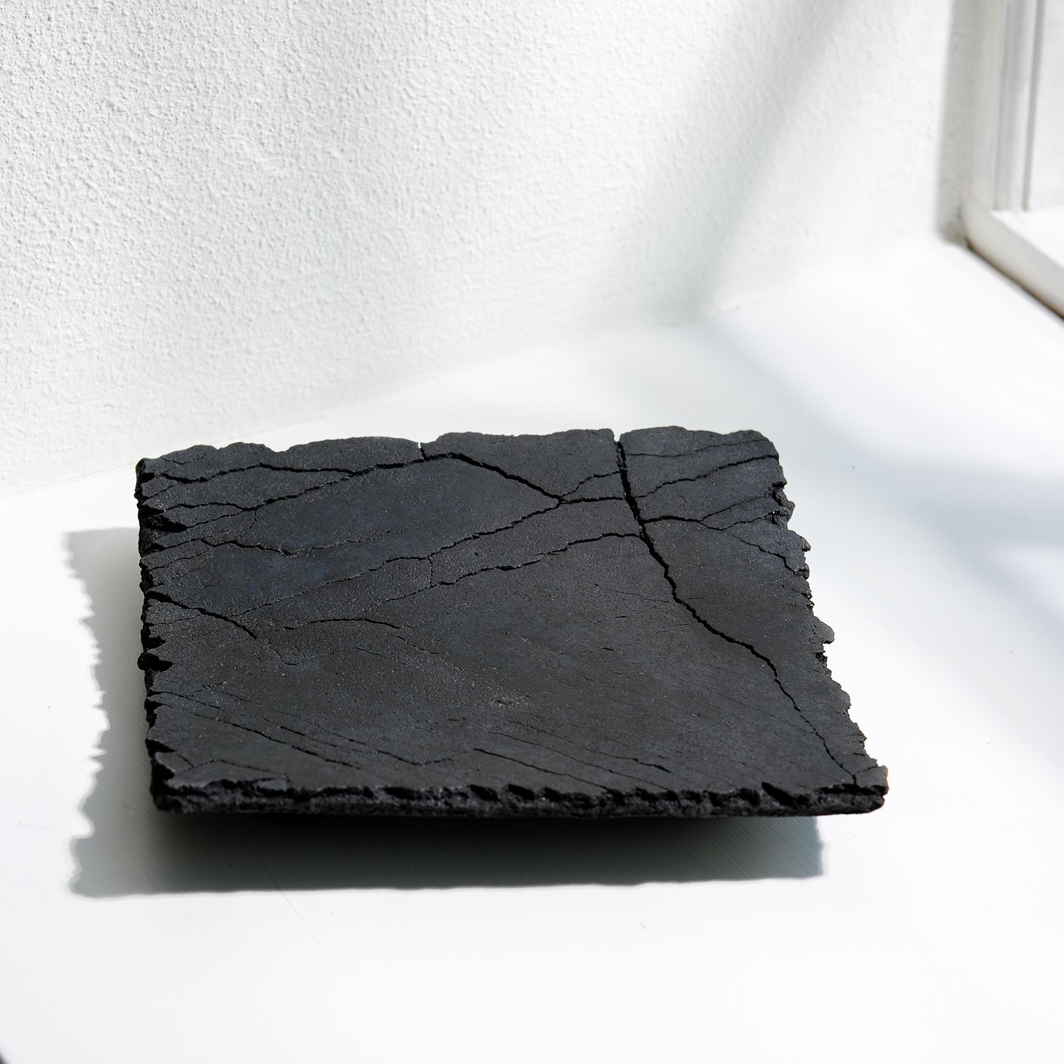 Über das Objekt: Gundula Sommerers schwarze Raku Schalen sind alles andere als gewöhnlich. Die in Aufbautechnik handgefertigten Objekte sind Unikate und jede Schale dieser Kleinstserie unterscheidet sich entweder in Form, Größe oder Oberflächenstruktur. Durch den Einsatz des Raku-Verfahrens beim Brennen der Objekte entsteht Kohlenstoff, der in die Poren der Schale eindringt und die Stücke dauerhaft tiefschwarz färbt. Dieses Schwarz in Kombination mit den Rissen in der Oberfläche der Schale, führt zu einer einzigartigen Individualisierung der Oberflächenstruktur. Sowohl optisch als auch haptisch. Das seidenmatte Tiefschwarz der Schalen harmoniert sowohl mit kräftigen, aber auch reduzierten Farben und bietet darin abgelegten Dingen eine grandiose Bühne. Diese Raku Schale ist mit Antikwachs poliert. Dadurch wird die Oberfläche unempfindlicher und leicht wasserabweisend. Trockene Lebensmittel könnten auf der Schale präsentiert werden, obwohl die Schale sich besser für Schlüssel oder Dinge eignet, die einem lieb und teuer sind. Die Schale hat eine Größe von ca. 20 cm x 20 cm und ist ca. 720 gr schwer. Sie ist Teil einer Kleinstserie und auch in anderen Größen und Formen erhältlich.