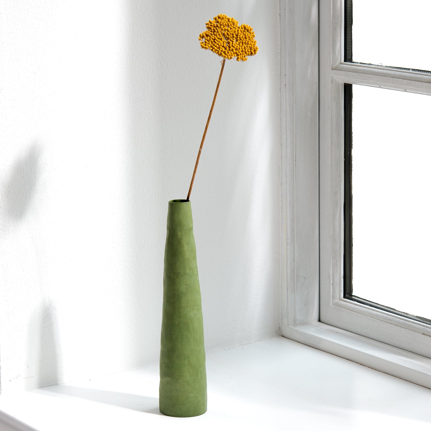 Über das Objekt: Silke Wellmeiers Porzellan Vase ist Teil ihrer Serie Grascolors und hier in einer leuchtend grünen Ausführung. Die schlanke Vase ist ca. 27 cm hoch, hat einem Durchmesser von 6 cm und wiegt ca. 180 Gramm. Sie hat eine seidenmatte, papierähnliche, haptisch sehr spannende Oberfläche und ist innenseitig mit einer transparenten Glasur glasiert und somit wasserdicht.