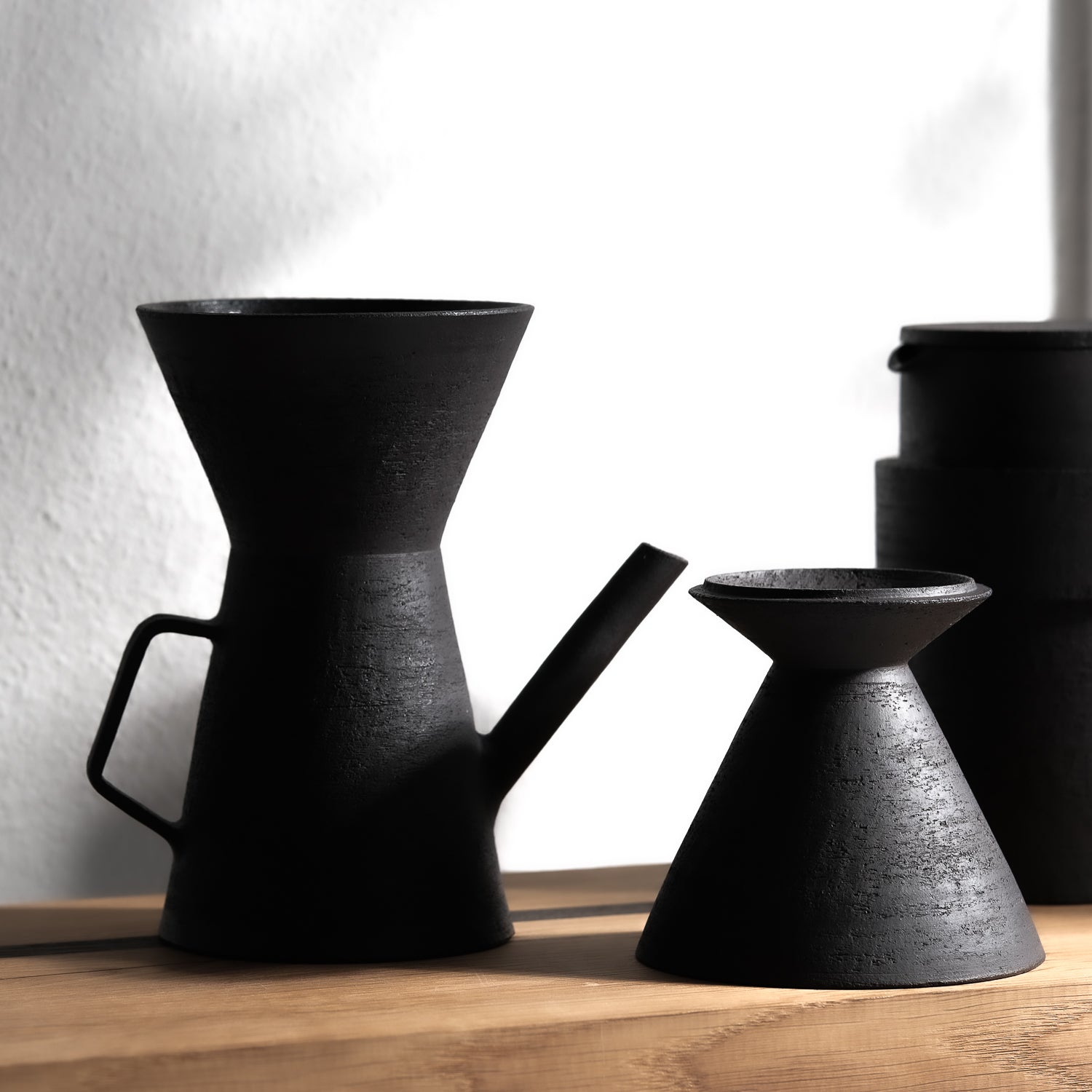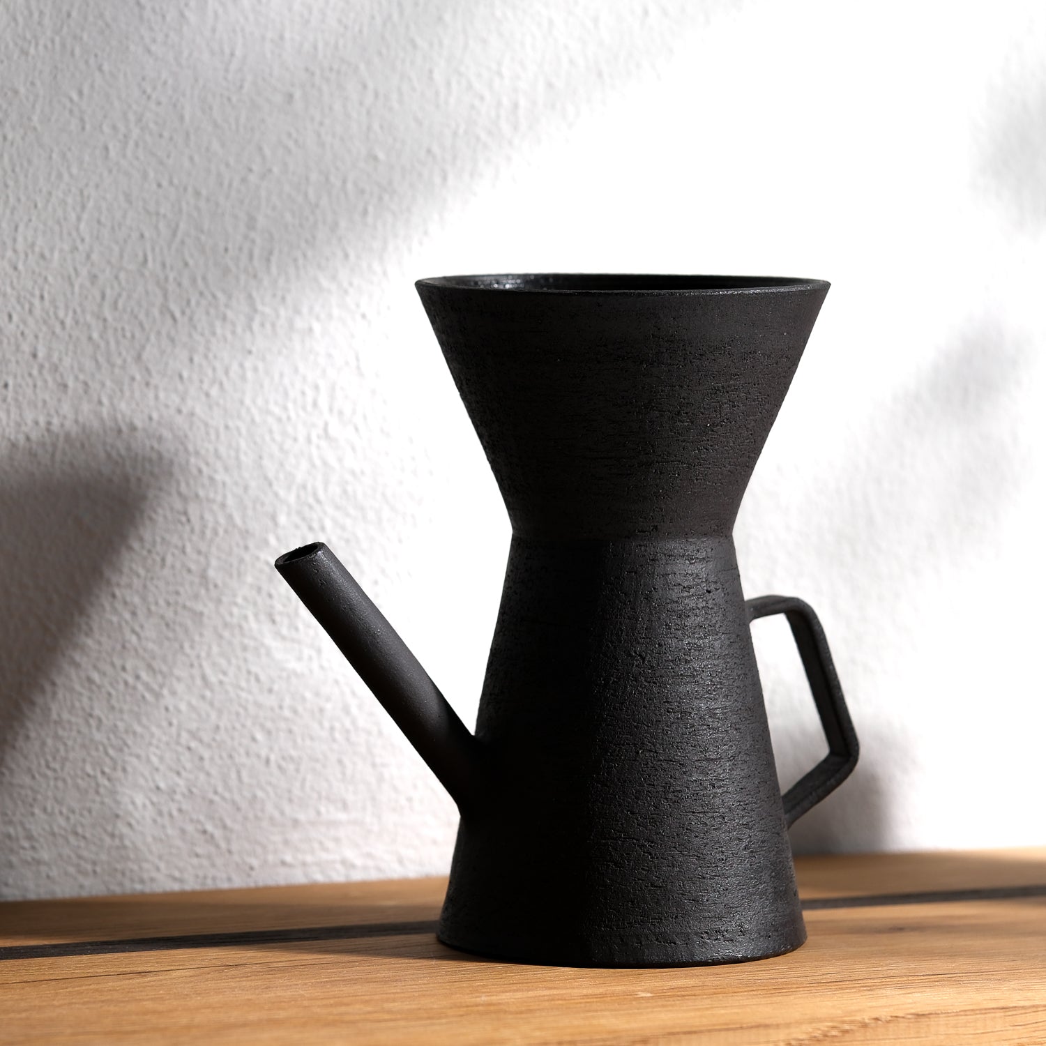 Über das Objekt: Saeam Kwons Kaffeekanne inklusive Filter ist aus fast schwarzen Steinzeugton gedreht und außen unglasiert, wodurch die feine, aber raue und sehr ausdrucksstarke Oberfläche stark zur Geltung kommt. Innen ist die Kanne transparent glasiert. Das stylische Unikat hat eine Gesamthöhe von ca. 16 cm und ein Fassungsvermögen von ca. 200 ml. Ausreichend, um eine von Saeams Kaffeetassen mit Kaffee zu befüllen. Als Filterpapier würde sich zum Beispiel das Hario V60 01 eignen oder ein anderes konisches Filterpapier der Größe 01.