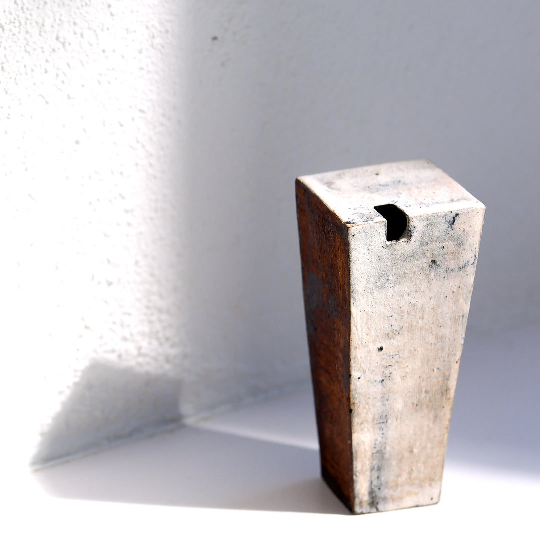 Tomoko Iwata erstellt Dinge nach dem japanischen Konzept „Utsuwa“: schöne Dinge für den täglichen Gebrauch. Ihre Einzelblumenvasenserie „Kusano Utsuwa“ ist nach dem Tatara Verfahren hergestellt. Tatara ist ein Verfahren zum Formen von Tonplatten durch Biegen oder Zusammenfügen auf einem Brett oder einer ebenen Fläche. Tomoko nutzt Tatara-Zukuri um ihre quadratischen, rechteckigen oder trapezförmigen Vasen aus flachen Tonplatten herzustellen.