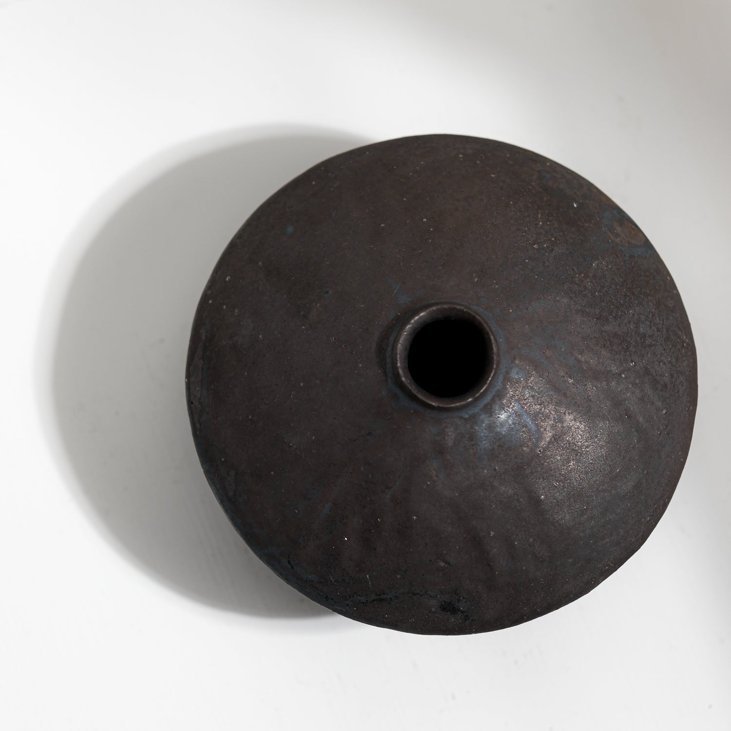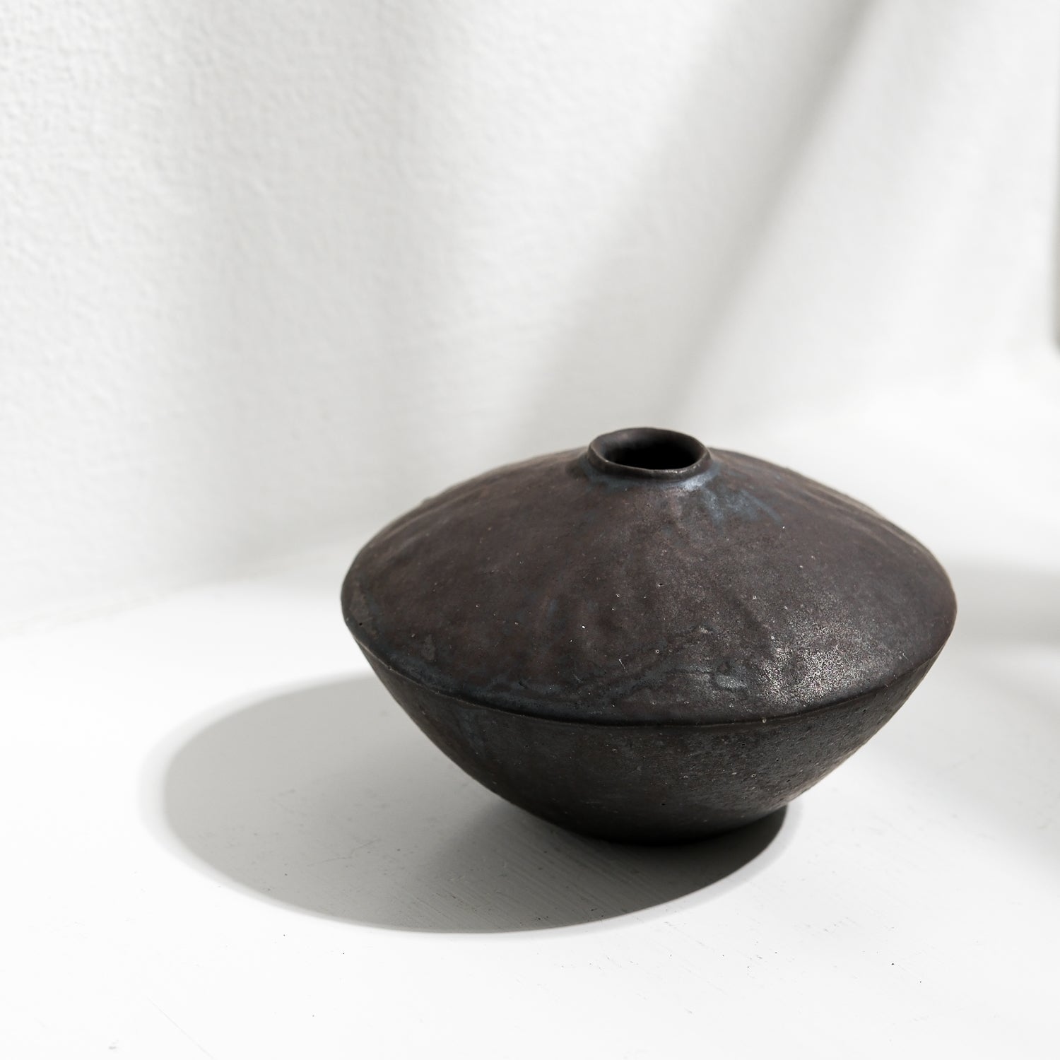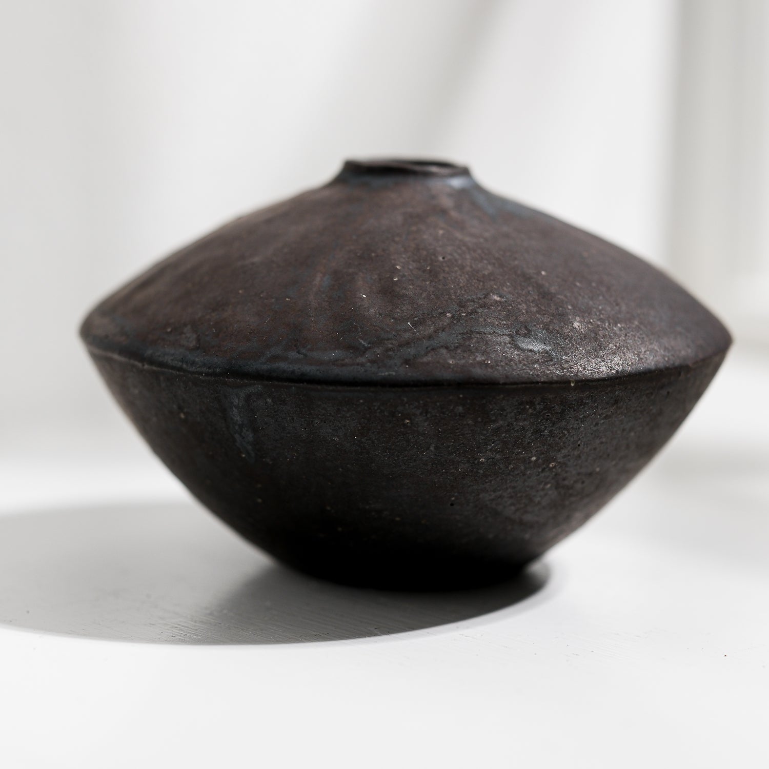 Über das Objekt: Tomoko Iwatas Vase hat eine Höhe von ca. 8,5 cm und einen Durchmesser von 13 cm. Sie erinnert an einen umgekehrten Kegel und ist aus dunklem Ton getöpfert und trägt eine dunkle, beinahe schwarze Glasur. Diese Vase ist Teil von Tomokos Einzelblumenvasenserie "Kusana Utsuwa". Die Vase ist wasserdicht und somit für frische, als auch getrocknete Einzelblumen geeignet. Oder kleine Zweige.