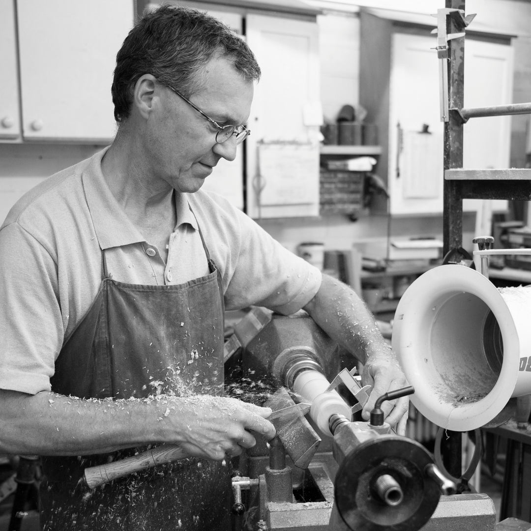 fondness for local woods. His main focus is on fruit and ornamental woods, whose grains tell a bit of the story of the trees and which come from Hergen's immediate surroundings. Knotholes, cracks, color changes between heartwood and sapwood or even color changes caused by the influence of a tree fungus are particularly pleasing to his heart.