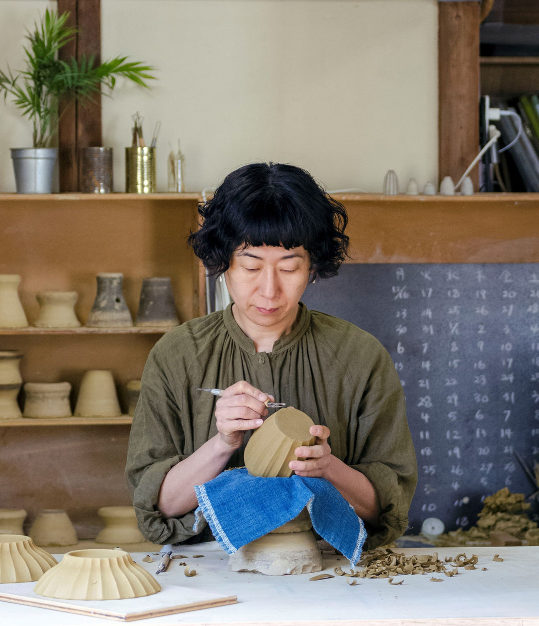 Yumiko Shimoya follows the concept of Utsuwa ("ceramics that gently blend into everyday life") and produces beautiful vases and vessels using the Shinogi technique. Shinogi is a carving technique in which a pattern is carefully carved into the surface of the pottery using suitable tools. This technique has been used since ancient times and, despite its precision, is subject to subtle variations that are unique to the craft.