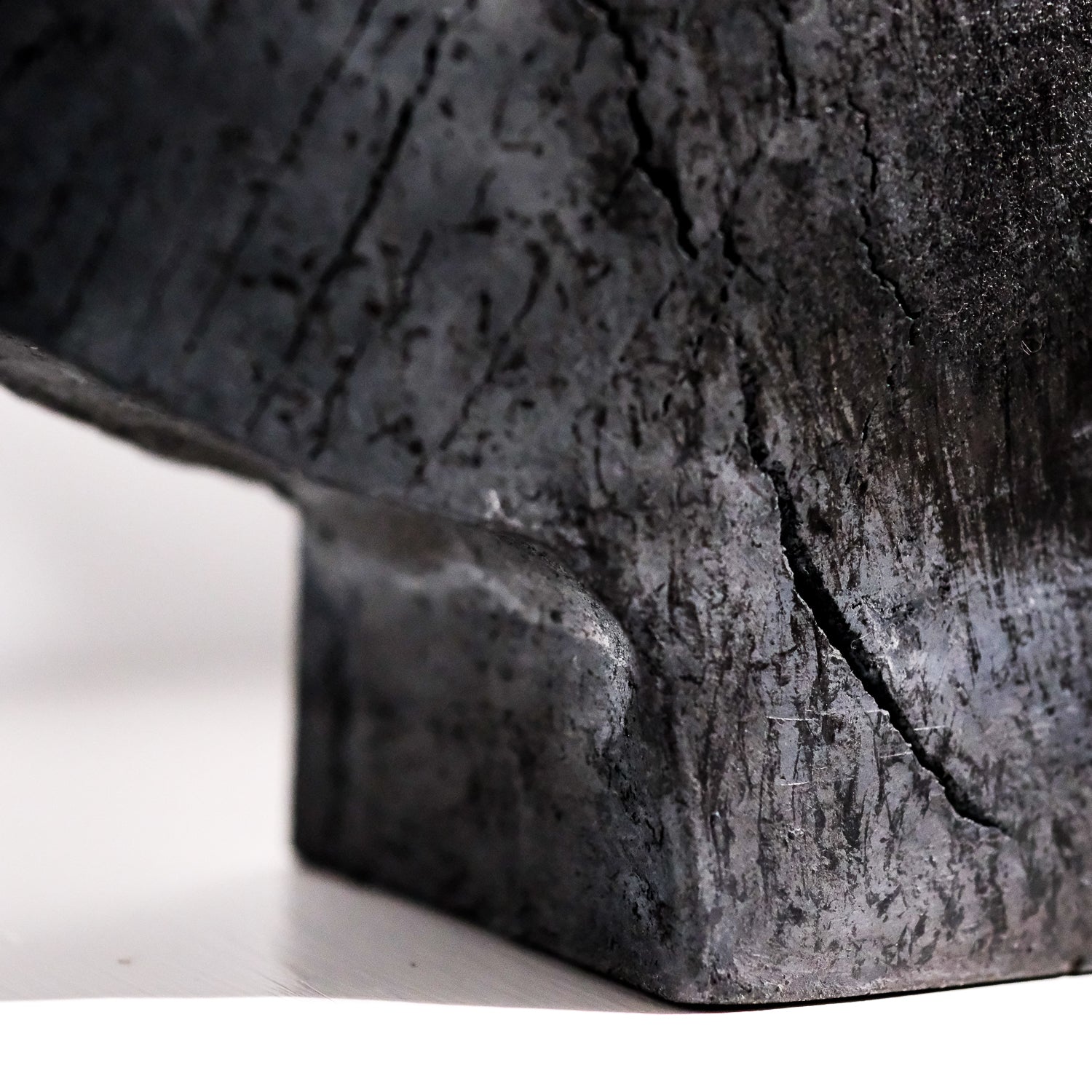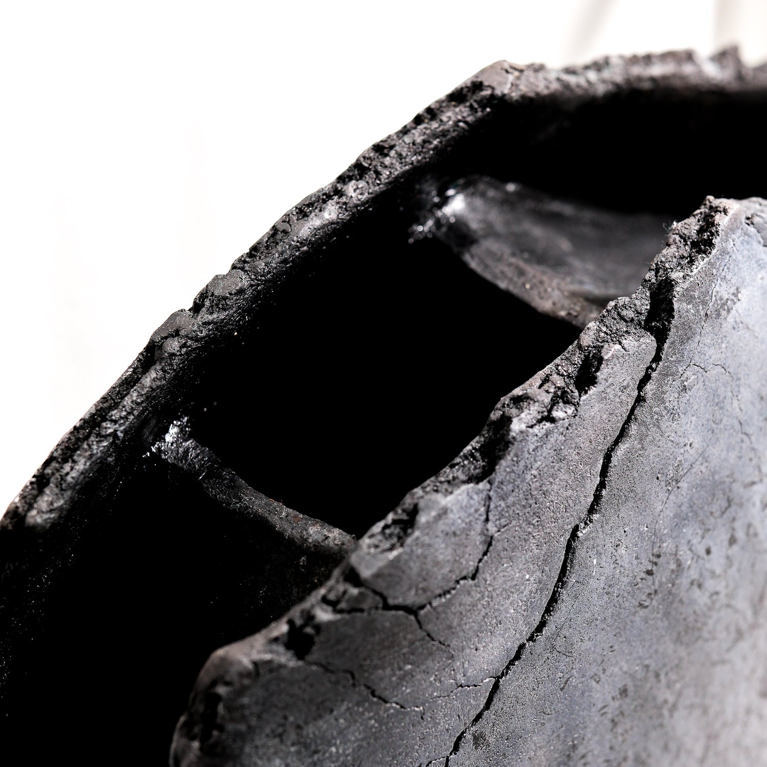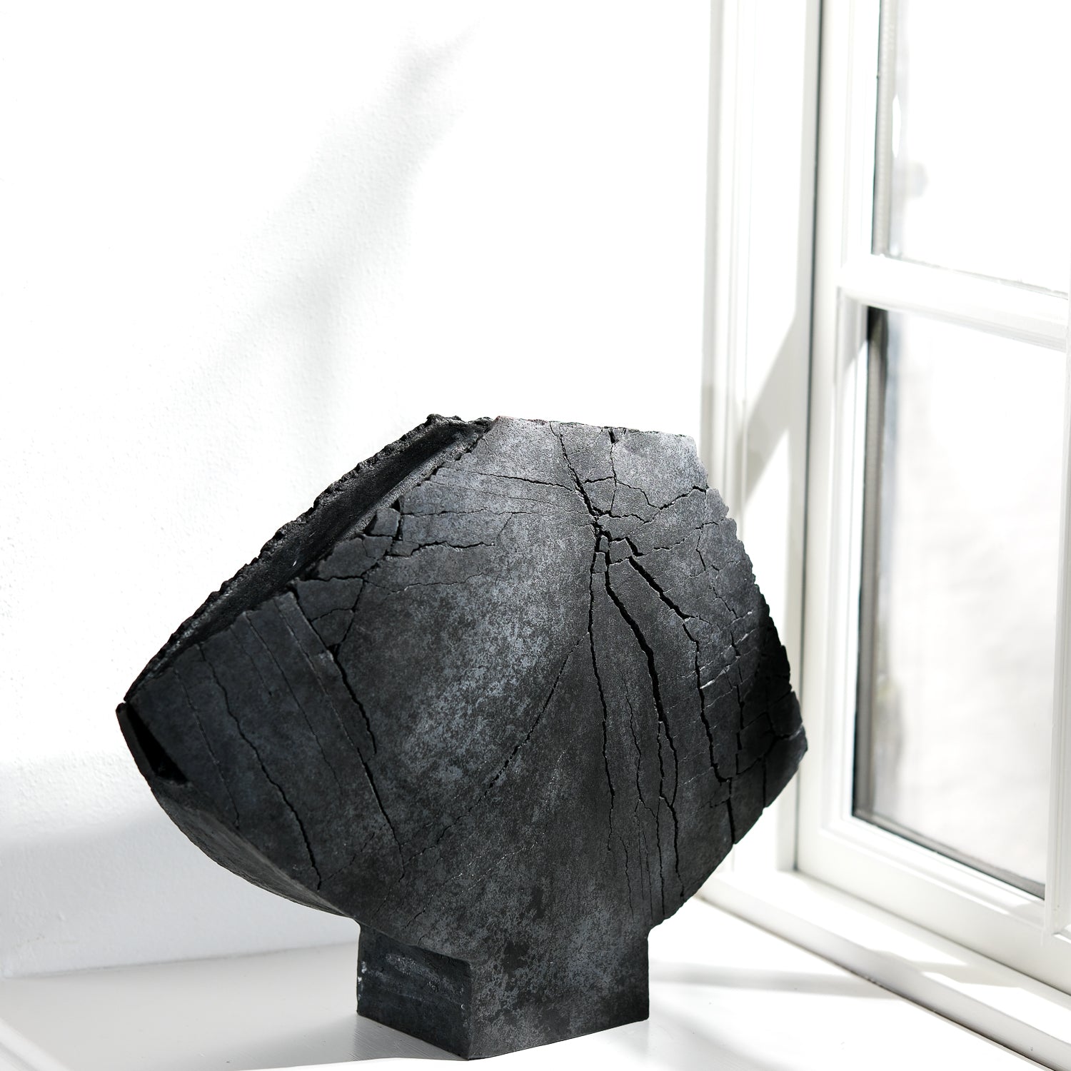 About the object: Gundula Sommerer's asymmetrical pitch-black winged vases "stand for themselves". The objects, which are handmade using the build-up technique, are unique and, with sizes of up to 50 cm in width, are extremely striking in their appearance with a very high recognition value. The use of the Raku process when firing the objects produces carbon, which penetrates the pores of the vase and gives the pieces a permanent deep black color. This black, in combination with the cracks in the surface of the vase, leads to a unique individualization of the surface structure. Both visually and haptically. This winged vase is approx. 35 cm high, approx. 48 cm wide at its widest point and up to 11 cm thick. The opening of the watertight vase is narrow, making the object wonderfully suitable for long-stemmed delicate bouquets, field and cornflowers, grasses or individual twigs. Gundula Sommerer produces this vase in different sizes in small series.