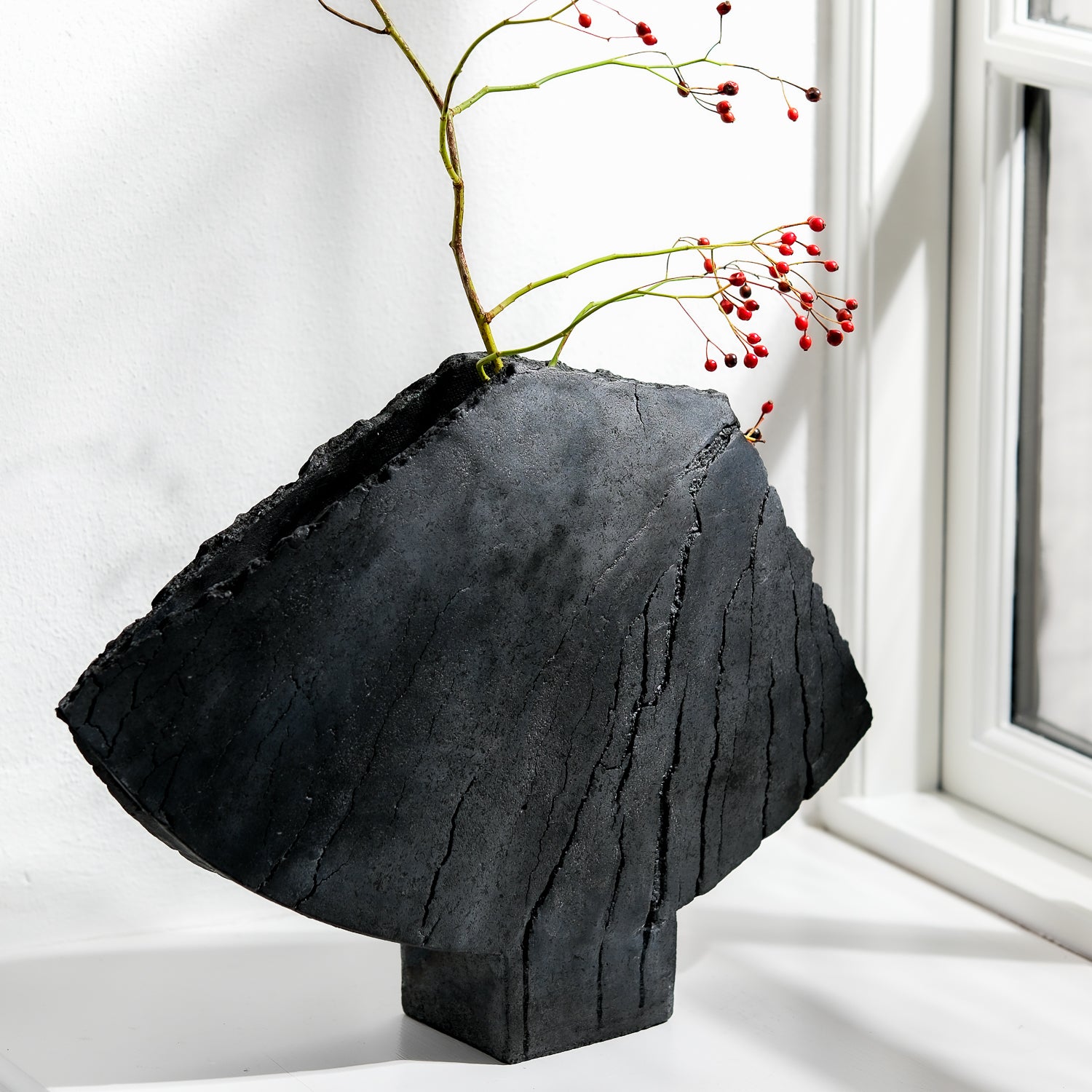 About the object: Gundula Sommerer's asymmetrical pitch-black winged vases "stand for themselves". The objects, which are handmade using the build-up technique, are unique and, with sizes of up to 45 cm in width, are extremely striking in their appearance with a very high recognition value. The use of the Raku process when firing the objects produces carbon, which penetrates the pores of the vase and gives the pieces a permanent deep black color. This black, in combination with the cracks in the surface of the vase, leads to a unique individualization of the surface structure. Both visually and haptically. This winged vase is approx. 30 cm high, approx. 40 cm wide at its widest point and up to 6.5 cm thick. The opening of the watertight vase is narrow, making the object wonderfully suitable for long-stemmed delicate bouquets, field and cornflowers, grasses or individual twigs. Gundula Sommerer produces this vase in different sizes in small series.