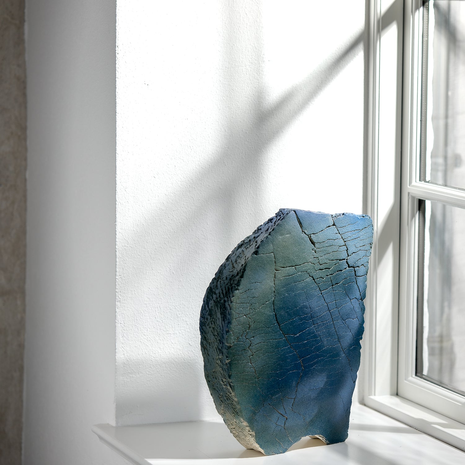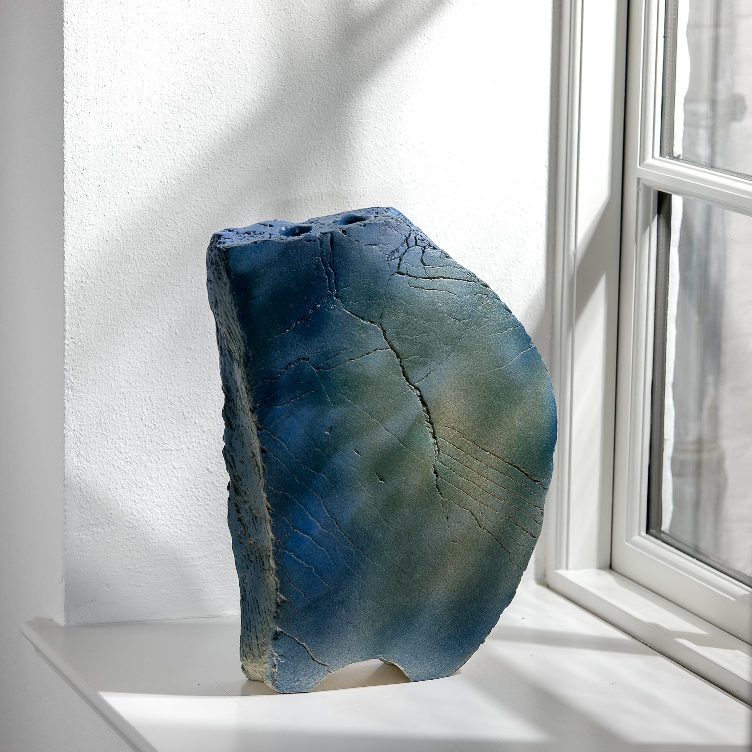 About the object: Gundula Sommerer's blue vase made of stoneware impresses with its exciting design, is handcrafted and created using the slab technique. The shape, which is remotely reminiscent of a 7-star hotel in Dubai, is in stark contrast to the surface, which looks as if the vase was carved directly from a field of solidified lava. The bluish beige shades of the approx. 38 cm high vase created by an engobe, in combination with the many cracks in the surface, are a real eye-catcher and make this watertight vase look unique with or without flowers. The opening of the vase is round but small, making the object suitable for long-stemmed delicate bouquets, field and cornflowers, grasses or individual branches. Due to its high weight of approx. 4.6 kg, the vase is stable. Gundula Sommerer produces this vase in small series. Each vase is unique.