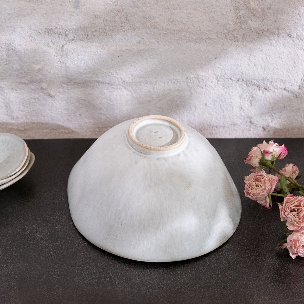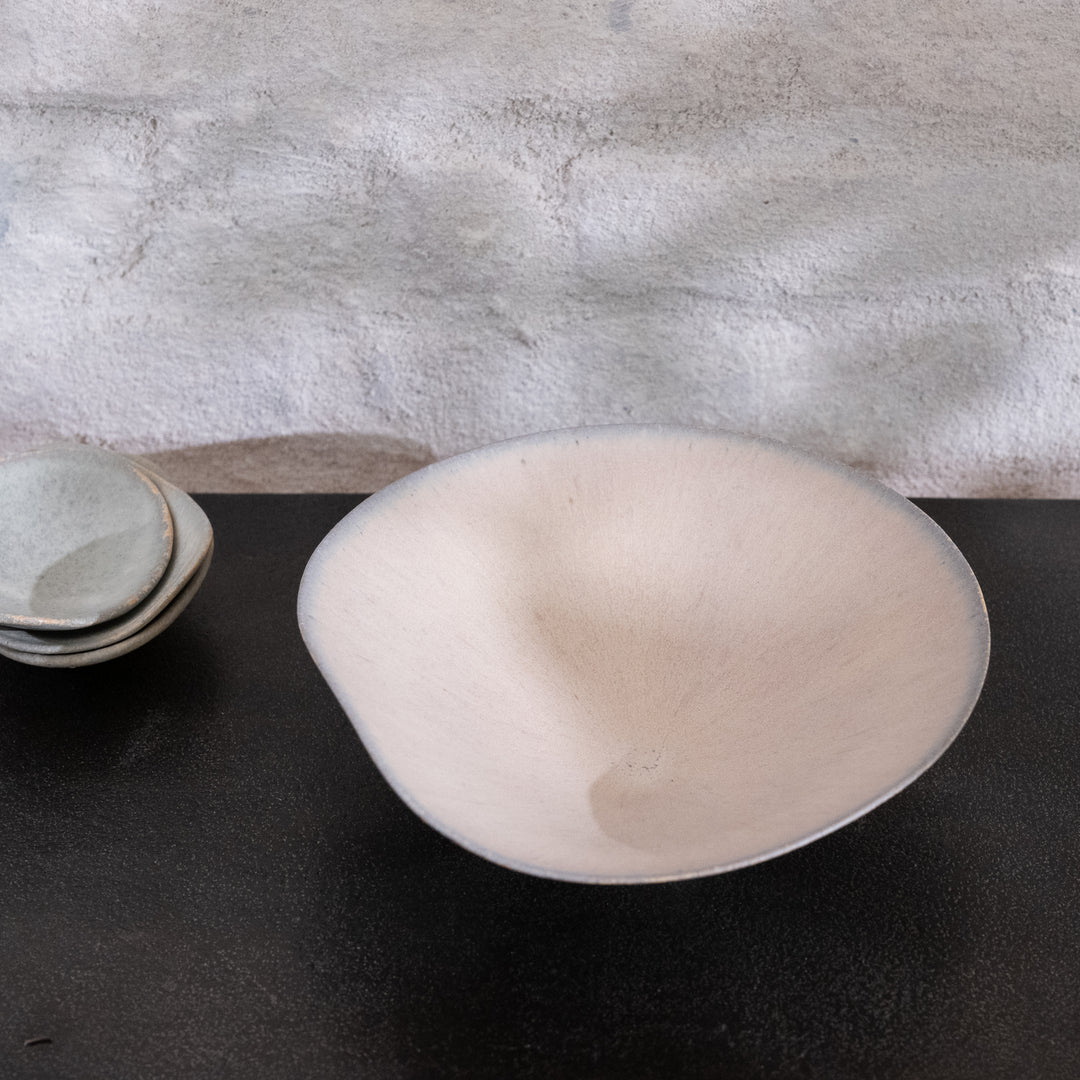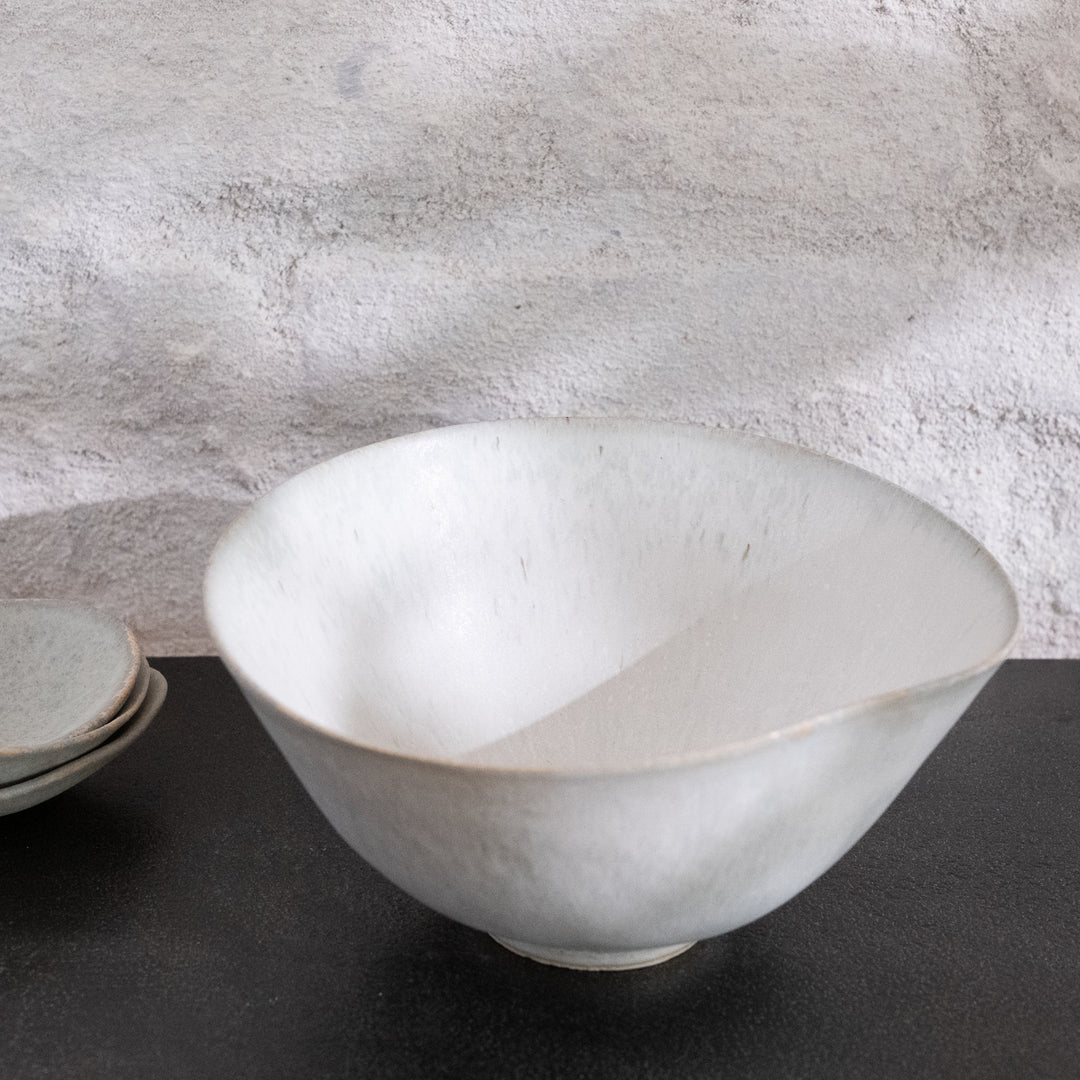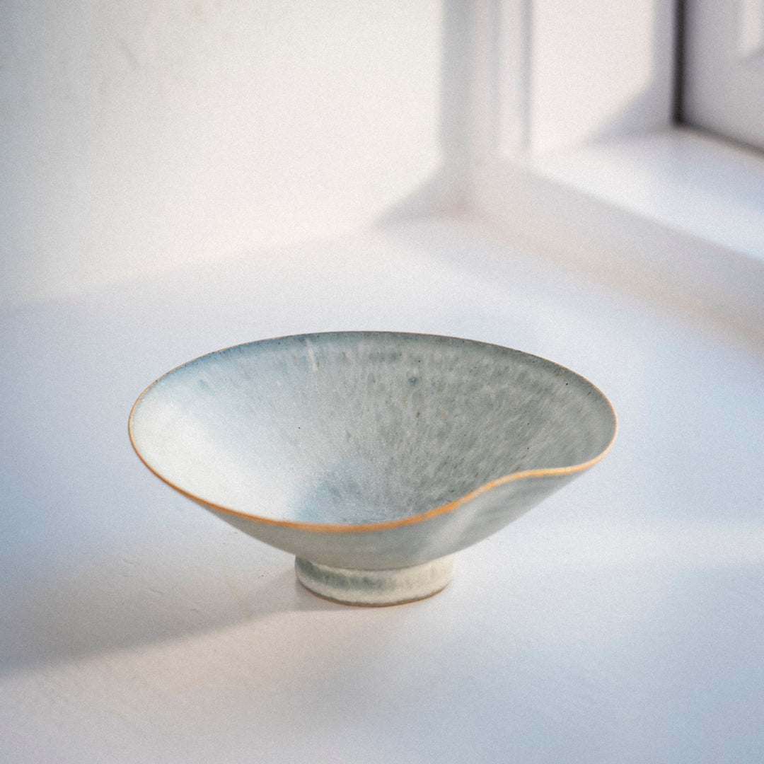 Bisui Ishikawa dreht ihre zarten, leichten Schalen auf der Töpferscheibe und formt die Ränder nach Belieben. Diese Formgebung, die laut Bisui Stimmungs- und Tagesformabhängig ist, erzeugt Kurven in der Schale, die zu der Schale passt und die die Schalen einmalig machen. Bisui dreht ihre Vasen auf der Töpferscheibe, aber die Vasen, deren Form nicht die eines perfekten Kreises ist, werden von Hand gefertigt. Bisui bezeichnet die Zeit, in der sie nicht an der Töpferscheibe steht, als Freizeit. Handgefertigte Vasen fertigt sie also in ihrer Freizeit.
